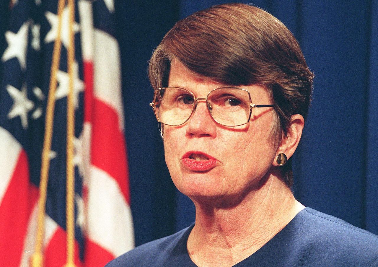 司法部長珍妮特·雷諾在華盛頓舉行新聞發佈會,1998年。照片:法新社通過蓋蒂圖片社