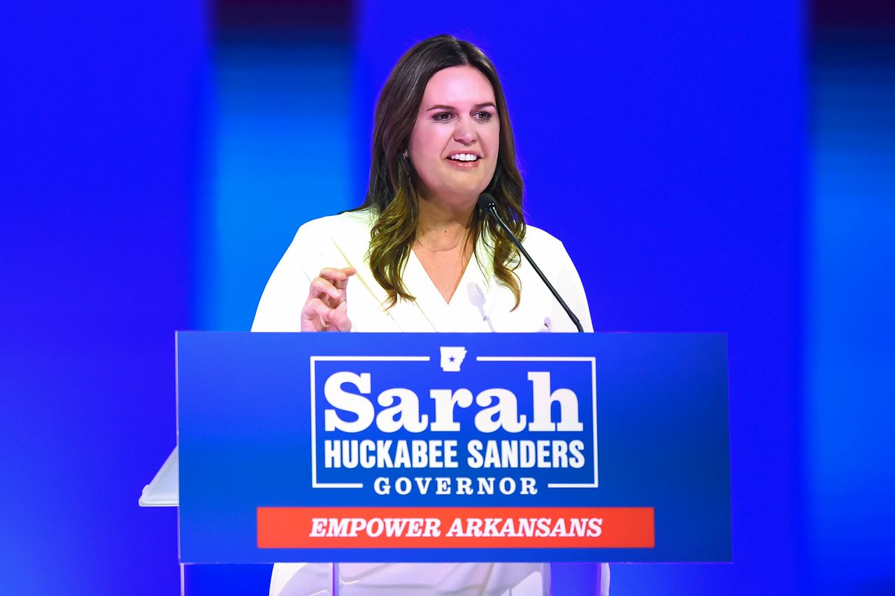 阿肯色州候任州長莎拉·赫卡比·桑德斯曾任特朗普政府白宮新聞秘書。圖片來源:威爾·牛頓/美聯社2022年參與州長競選的女性人數創歷史新高。今年共有69名女性作為主要政黨候選人蔘加初選,打破了此前61人的紀錄。其中25名女性成為政黨提名人,超過此前16人的峯值。