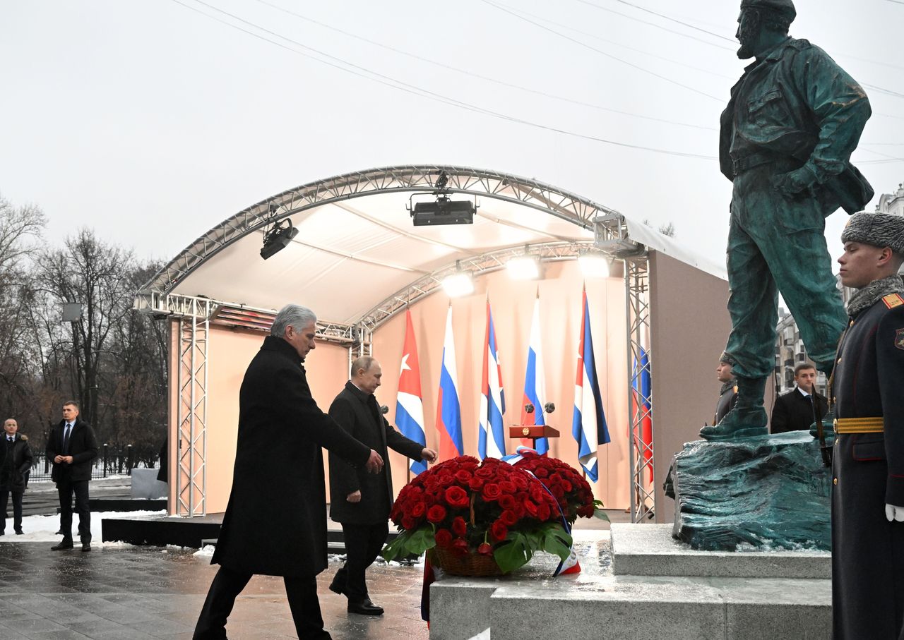 11月22日,古巴總統米格爾·迪亞斯-卡內爾與俄羅斯總統弗拉基米爾·普京在莫斯科共同出席菲德爾·卡斯特羅紀念碑揭幕儀式。圖片來源:謝爾蓋·薩沃斯季亞諾夫/克里姆林宮新聞社//Shutterstock本文刊登於2022年11月29日印刷版,標題為《菲德爾雕像落户莫斯科》。