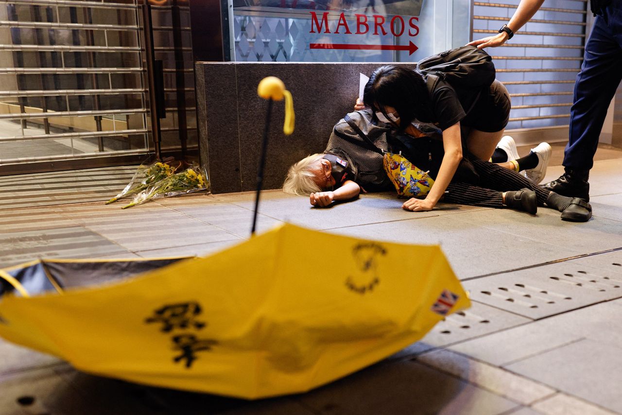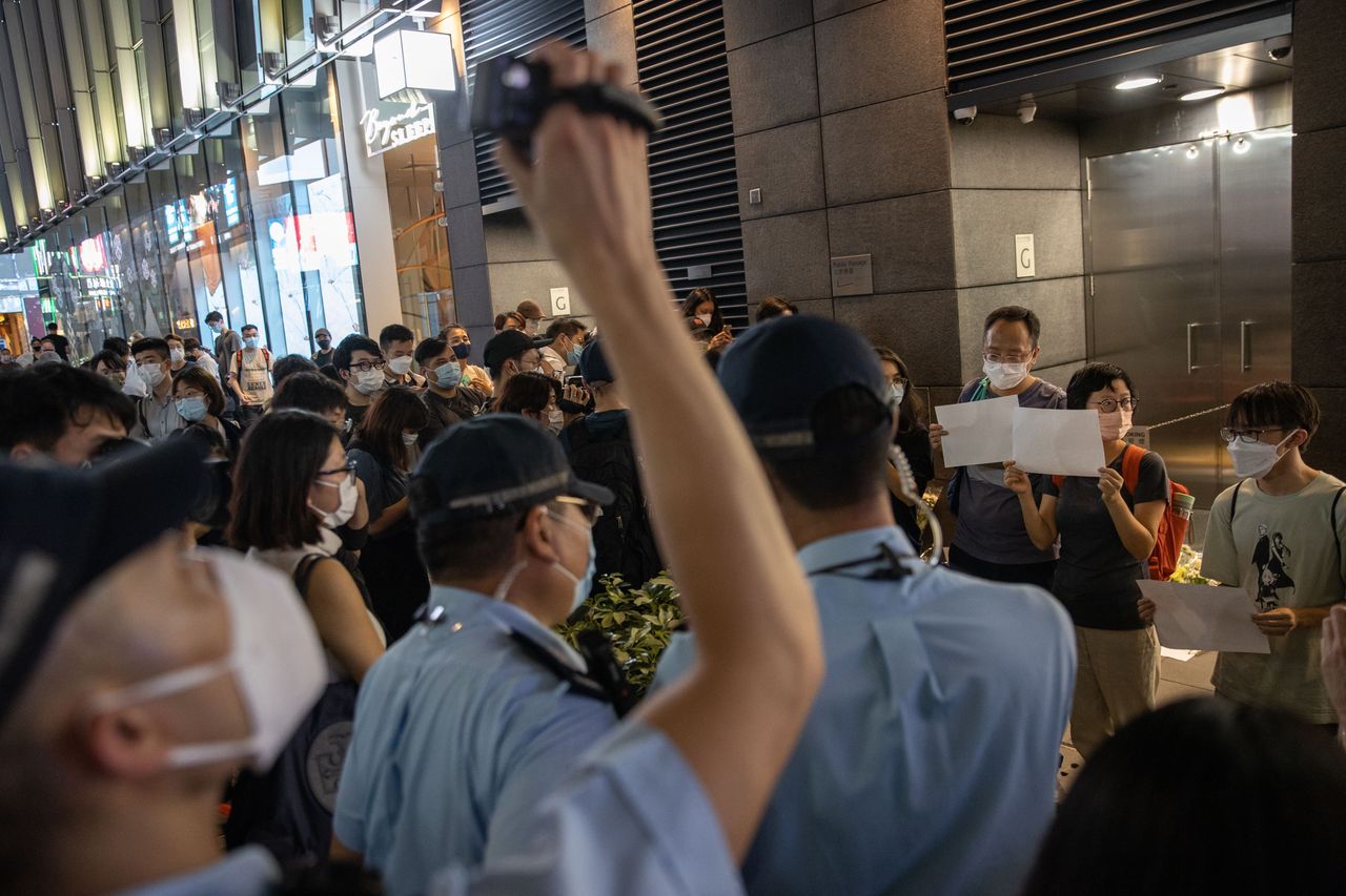 警方在拍攝並記錄下香港中心區小規模抗議者的個人信息後,強制驅散了他們。抗議者在奢侈品店外擺放了臨時守夜的花束、蠟燭和寫有信息的紙張。