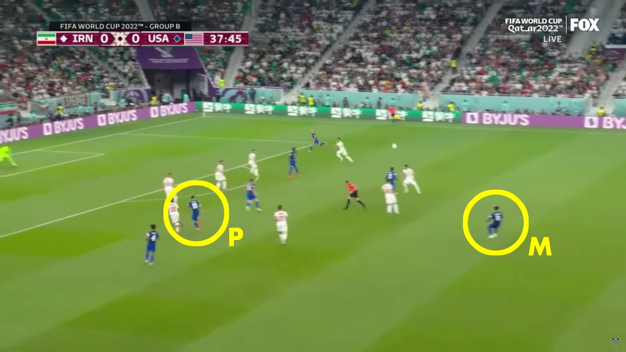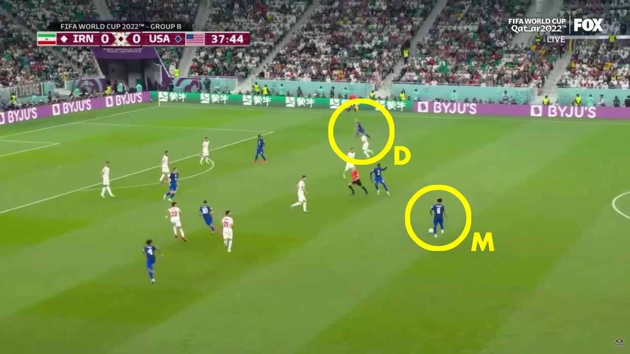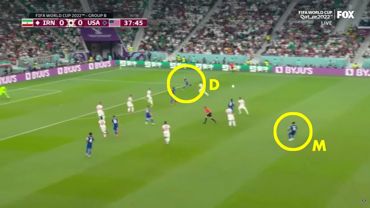 關鍵進攻始於泰勒·亞當斯將球傳給中場隊友韋斯頓·麥肯尼,後者當時在中圈與伊朗禁區邊緣之間緩步移動。當所有人注意力都集中在持球的麥肯尼身上時,另一位美國球員已啓動戰術跑位——邊後衞塞爾吉諾·德斯特。