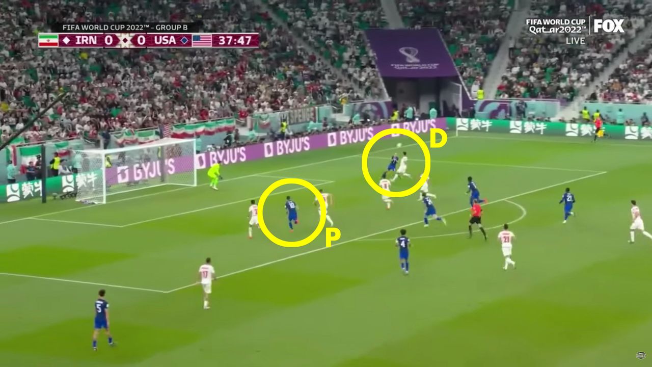 當麥肯尼的球傳到德斯特(D)時,普利西奇(P)已經衝向球門。照片插圖:福克斯德斯特的頭球不可能傳得更好了。普利西奇處於伊朗隊三人防守的中間,球仍然找到了他。即使德斯特的頭球不是完美的,對伊朗的後衞來説這仍然是一個不舒服的局面。面對自己的球門,球在六碼區邊緣彈跳,他們沒有太多解圍的選擇。風險是將球砸進自己的球門。門將也被打了個措手不及。在比賽早些時候,他已經在追球時鼻子受傷,可能不太願意再次冒險用臉攔截傳球。