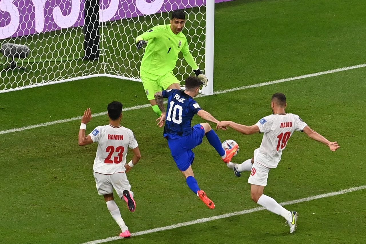 克里斯蒂安·普利西奇在兩名伊朗後衞和門將之間拿到球。照片:奧德·安德森/法新社/蓋蒂圖片社球幾乎彈到了普利西奇的腰部,但對於場上技術最出色的球員之一來説,這不成問題。他跳起來,用右腳捅射,為美國隊取得1-0領先。