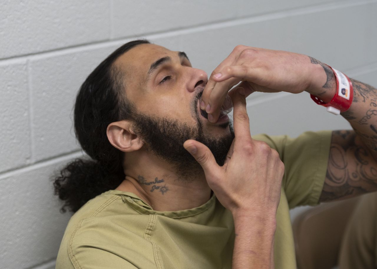 最近,傑森·達倫卡爾在監獄裏與其他囚犯排隊領取每日劑量的丁丙諾啡-納洛酮組合藥物。護士將藥片碾碎(防止囚犯將其作為違禁品交易)裝入袋中,通過鐵柵門遞給他。他一口吞下後等待獄警檢查口腔,確保藥物全部嚥下。