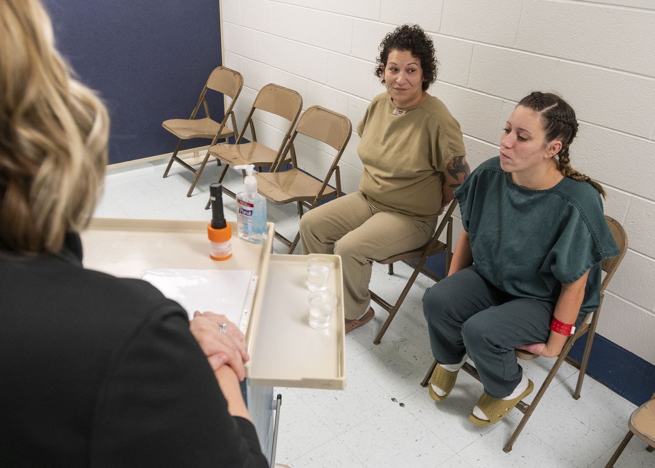 曾參與阿勒格尼監獄項目的安德魯·維尼,正在接受緩釋丁丙諾啡注射。攝影:《華爾街日報》的Nate Smallwood37歲的貝倫·韋布賴特表示,四月份她進入阿勒格尼監獄時骨瘦如柴,因吸食冰毒和芬太尼而神志不清。十月份獲釋前一天,她與在項目中結識的摩根·格拉布在監獄圖書館裏規劃未來。格拉布女士談到失去孩子並沉溺於毒癮的經歷,韋布賴特則講述了遭受虐待和性侵的往事。