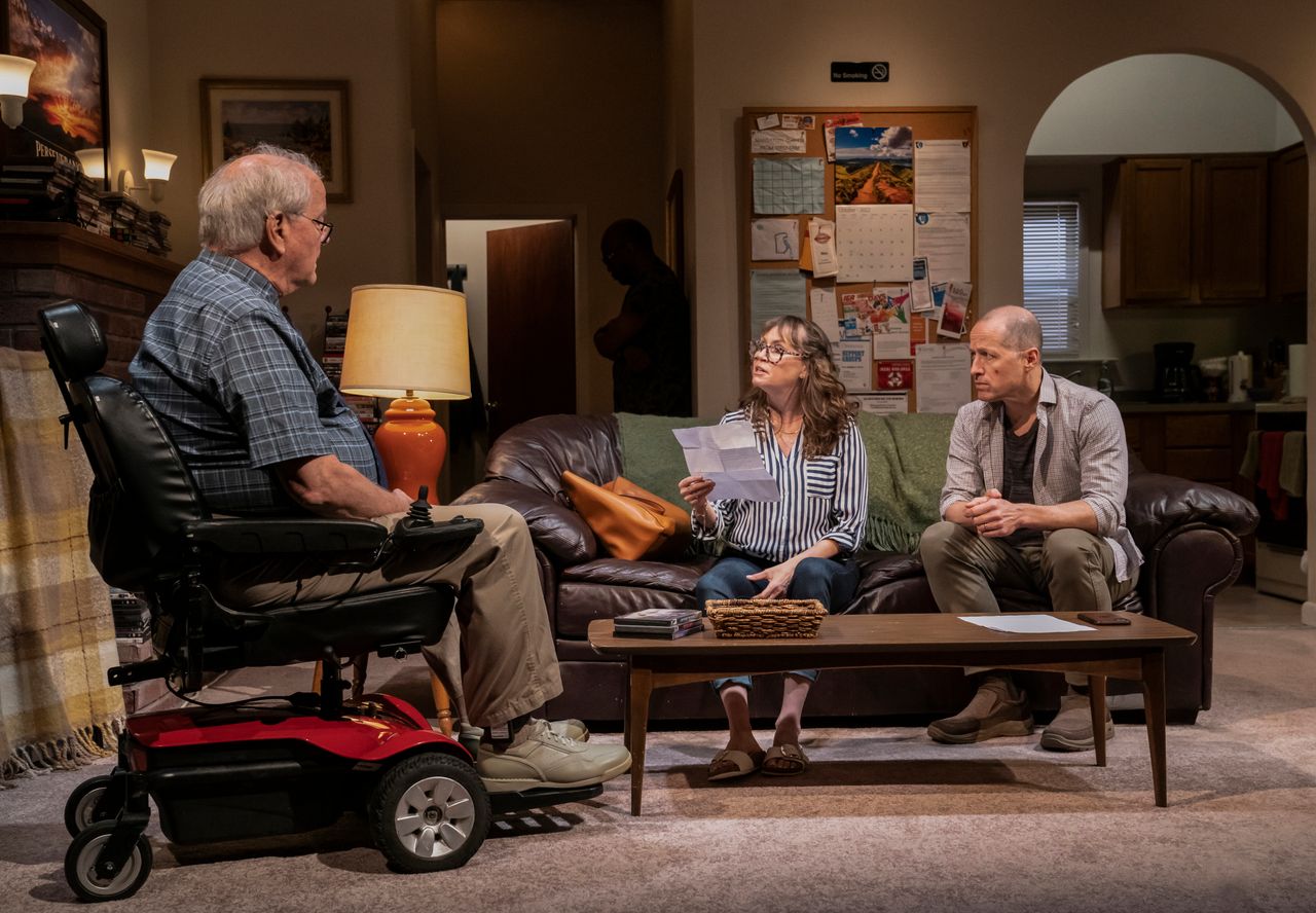《Downstate》中的弗朗西斯·吉南、莎莉·墨菲與蒂姆·霍珀攝影:瓊·馬庫斯另一部令人難忘的羣像劇生動呈現了布魯斯·諾里斯**《Downstate》**中那些令人不安的角色,這部真正令人不適的戲劇設定在一羣曾對未成年人實施性犯罪者的集體住所。劇本毫不迴避他們罪行的駭人細節,也深入探討了社會近乎流放這些人所引發的道德倫理問題。唯有諾里斯這般無畏的作家,才能憑藉無可挑剔的演員陣容(多數來自該劇起源地芝加哥的Steppenwolf劇院公司)將這看似令人反感的題材變得引人入勝且詭異地動人。