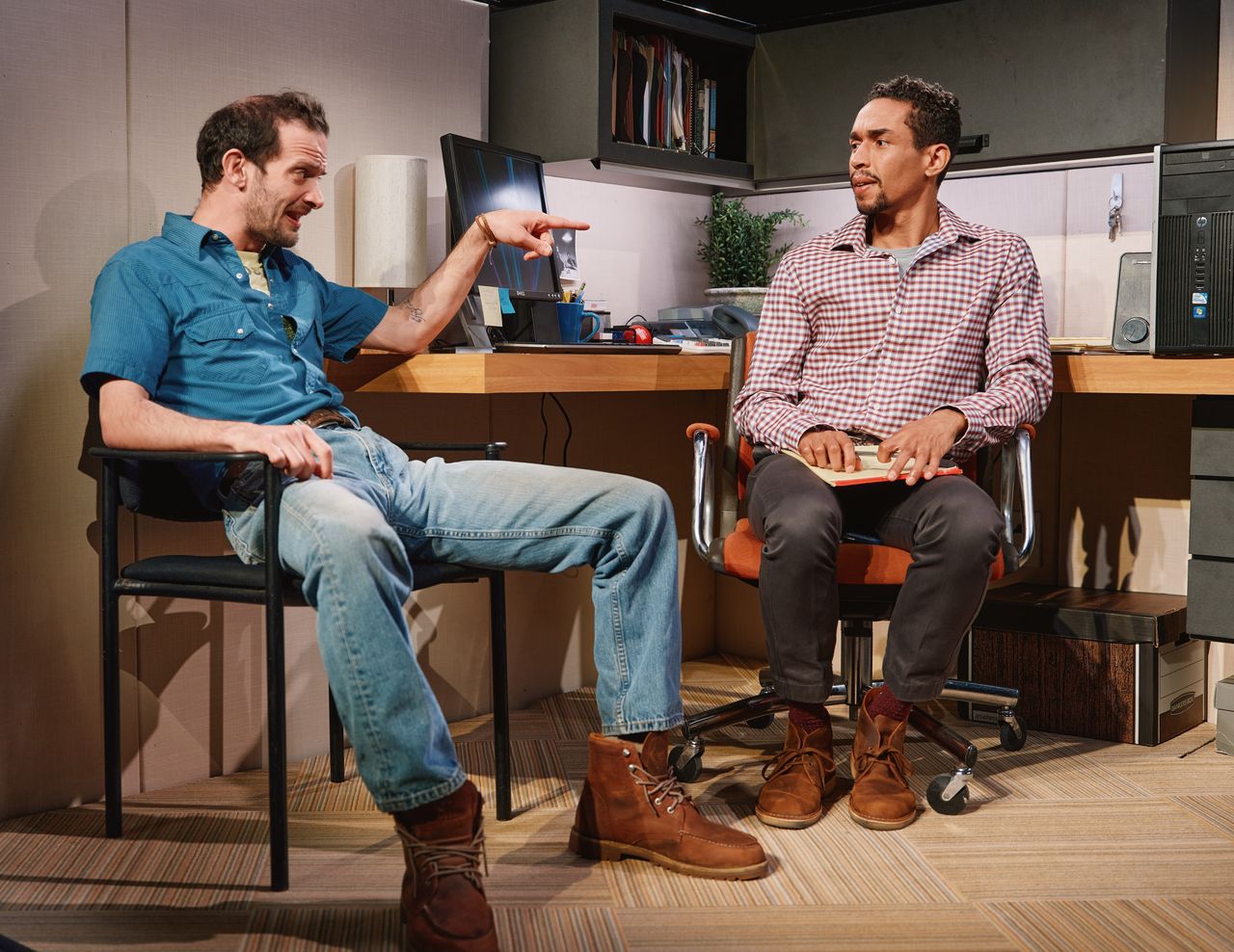 威爾·布里爾與凱爾·貝爾特蘭出演《上帝存在的證明》圖片來源:埃米利奧·馬德里顯然,打動人心未必需要滿台演員。瑪蒂娜·馬約克獲得普利策獎的**《生存成本》——由曼哈頓劇院俱樂部搬上百老匯的佳作,講述兩名殘障人士與他們的護理者(或潛在護理者)的故事——僅用四位演員就展現出親密史詩般震撼的情感深度。有時兩人戲亦能出彩,比如塞繆爾·D·亨特的《上帝存在的證明》,這部細膩劇作講述兩個背景迥異的男人(凱爾·貝爾特蘭飾演的同性戀黑人抵押貸款經紀人,與威爾·布里爾飾演的深陷財務危機正辦理離婚的白人男子)因各自心愛的小女兒發現彼此紐帶。另一部出色的雙人戲是約瑟夫·多爾蒂的《切斯特·貝利》**,這部二戰題材戲劇講述一位精神科醫生治療拒絕接受可怕事故真相的年輕患者。飾演這對醫患的演員——無可估量的裏德·伯尼與以法蓮·伯尼父子——為這部本就層次豐富的劇作增添了額外的質感。