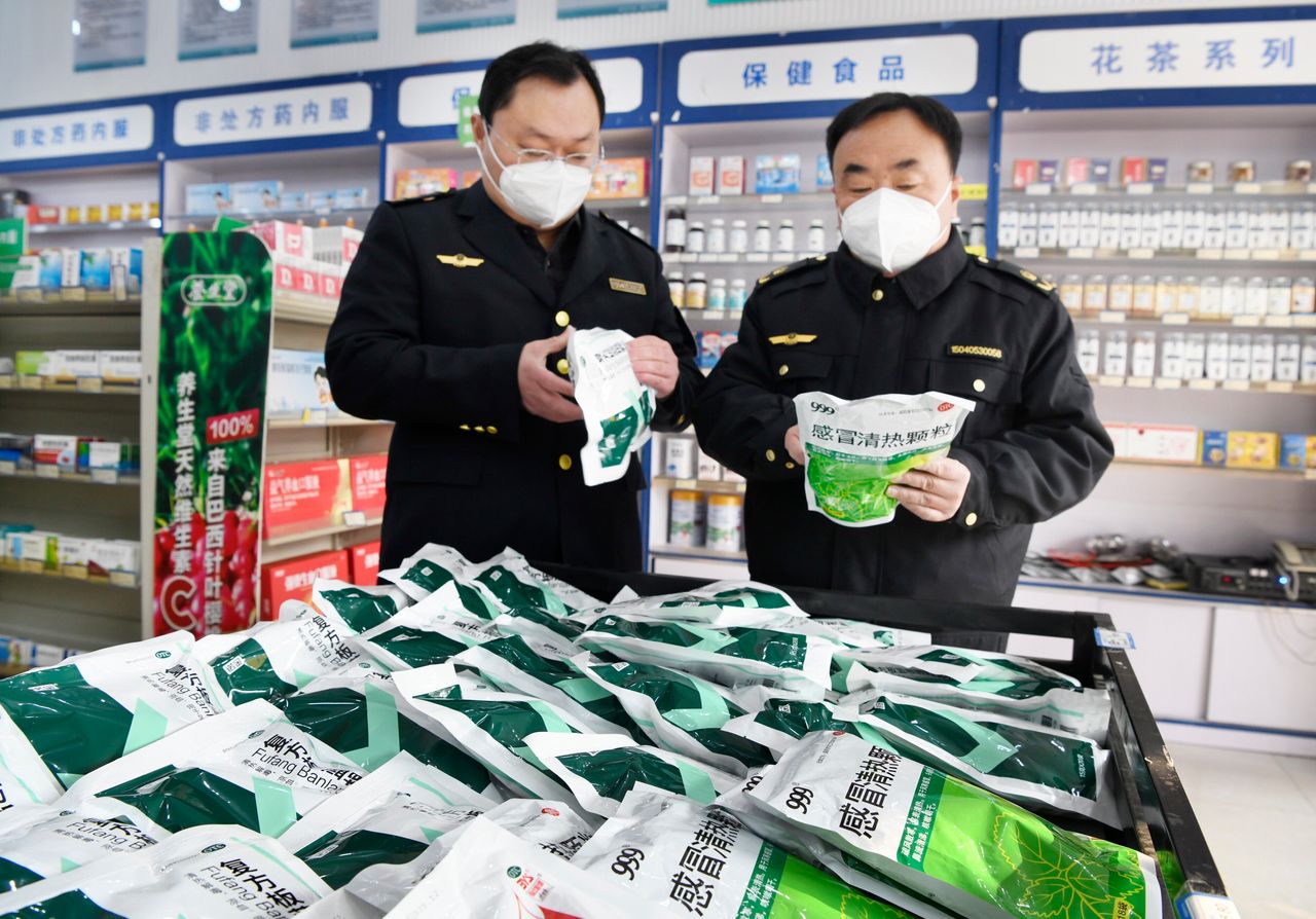 12月9日,中國山東執法人員在一家藥店檢查防疫藥品。圖片來源:Cfoto/Zuma Press2021年,學術期刊《植物醫學》對前一年一項同行評議研究發佈更正聲明,該研究曾得出連花清瘟有助於緩解輕中度新冠患者發熱、乏力和咳嗽症狀的結論。更正聲明披露,參與報告發表的人員中有一人是以嶺藥業創始人的女婿。