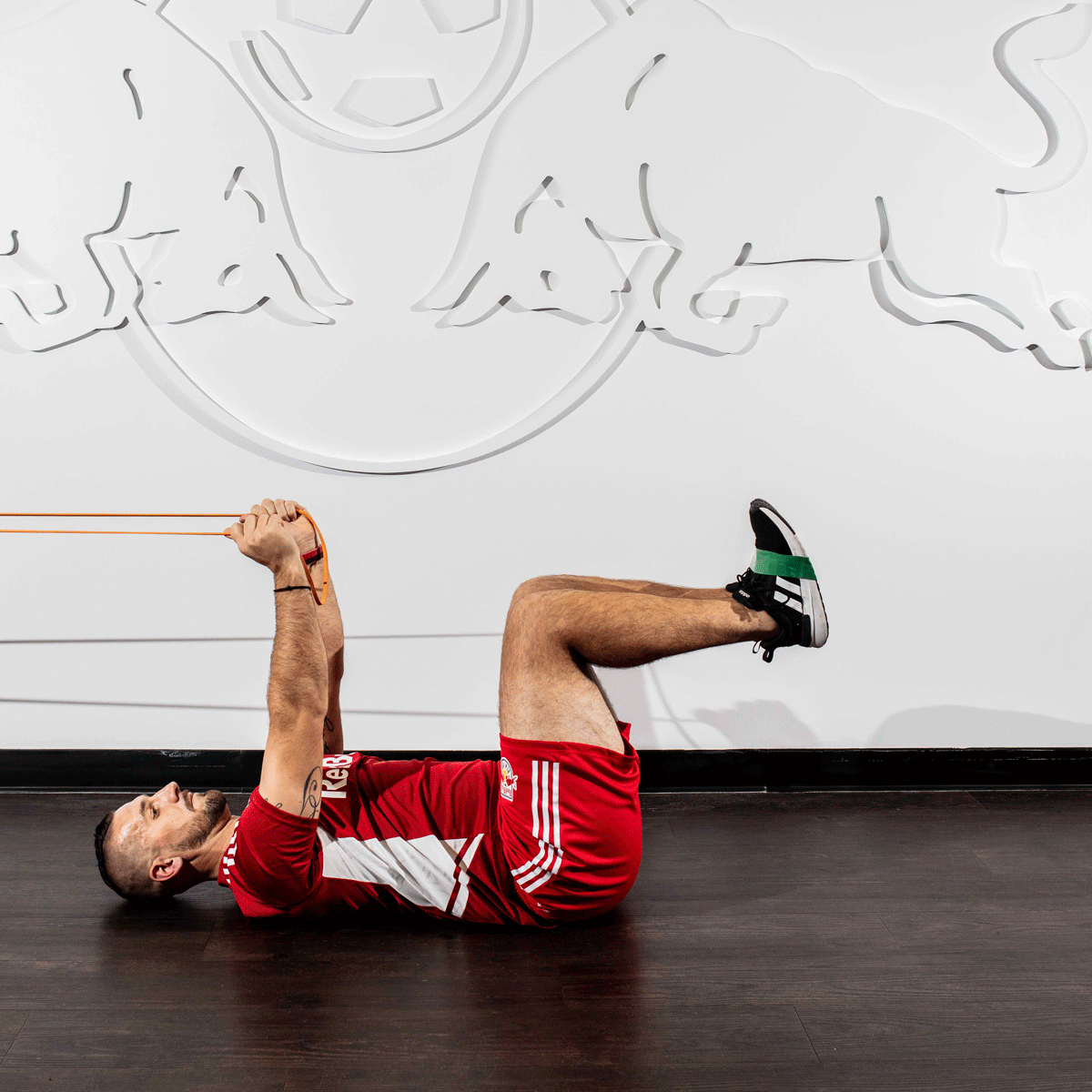 戈爾曼先生示範加速牆訓動作。### 核心激活****仰卧彈力帶髖屈曲