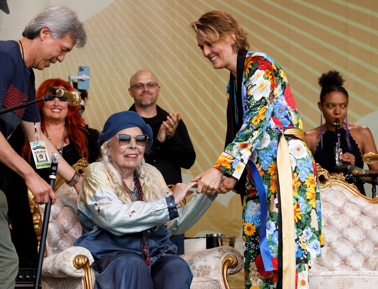今年七月,卡萊爾女士在紐波特民謠節上介紹了瓊尼·米切爾,這是米切爾時隔20年首次公開亮相。圖片來源:《波士頓環球報》卡林·斯蒂爾/蓋蒂圖片社**《華爾街日報》:**您如何幫助這些藝術家?是有專門的組織在做這項工作,還是更多通過巡演中結識的藝術家之間的人際互助?