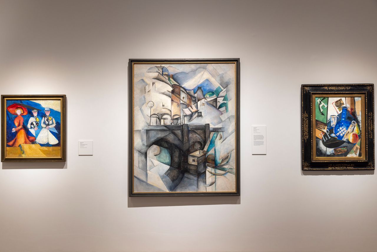 亞歷山德拉·埃克斯特的《橋,塞夫爾》(約1912年)是展覽中最早期的作品之一,這幅幾何構圖嚴謹的風景畫通過多重視角呈現出韻律與平衡。她1909-10年的《三位女性形象》及提森收藏的1913年靜物畫(本次展出了該博物館的多件館藏之一)同樣展現出簡化的破碎形態與漸進的抽象風格,而畫作中奔放的色彩——尤其是藍黃兩色——則體現了烏克蘭民間藝術的影響。