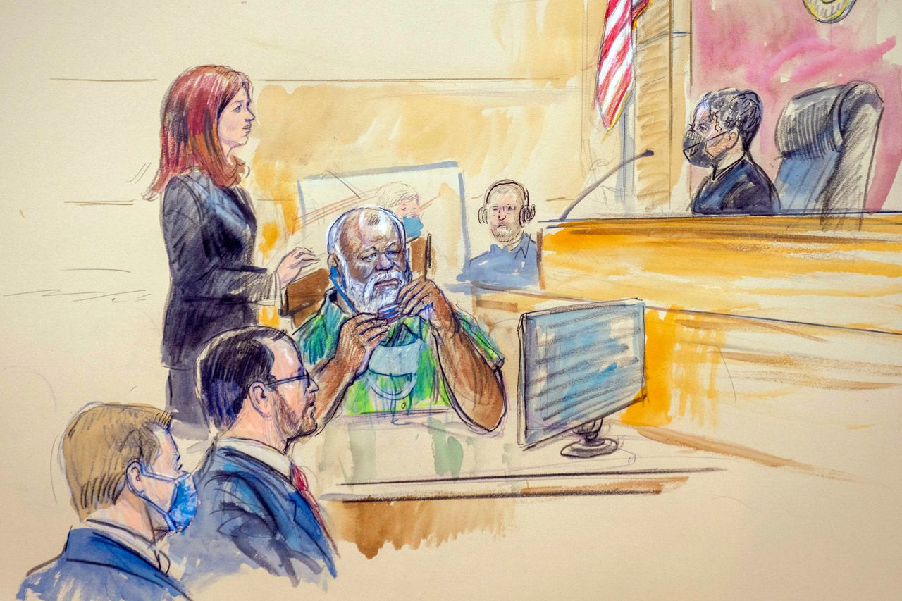 藝術家素描描繪了公設辯護人惠特尼·明特在華盛頓特區法庭上為被指控制造了導致泛美航空103航班爆炸的炸彈的阿布·阿吉拉·穆罕默德·馬蘇德(中)進行辯護。圖片來源:達娜·維爾考特倫/美聯社美國司法部週一告知法官,將不會對一名被指控組裝1988年在蘇格蘭洛克比上空炸燬泛美航空103航班的爆炸裝置的利比亞炸藥專家尋求死刑。