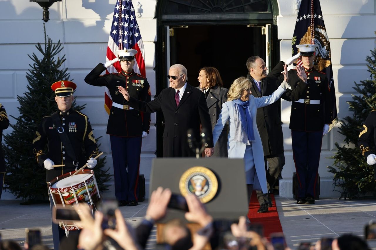 美國總統拜登和第一夫人吉爾·拜登,以及副總統卡瑪拉·哈里斯和第二先生道格·埃姆霍夫抵達白宮外的法案簽署活動現場。攝影:Ting Shen/彭博新聞社週二,拜登總統簽署了一項法案,使之成為法律,鞏固了同性婚姻權利。十年前,他宣佈支持同性婚姻,成為當時支持同性婚姻的最高級別民主黨人。