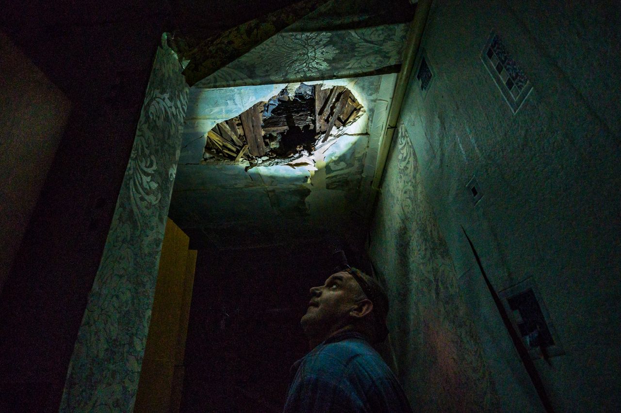 一名男子檢查他在烏克蘭頓涅茨克地區因炮擊造成的房屋破洞。照片:塞萊斯蒂諾·阿爾塞·拉文/祖瑪新聞社