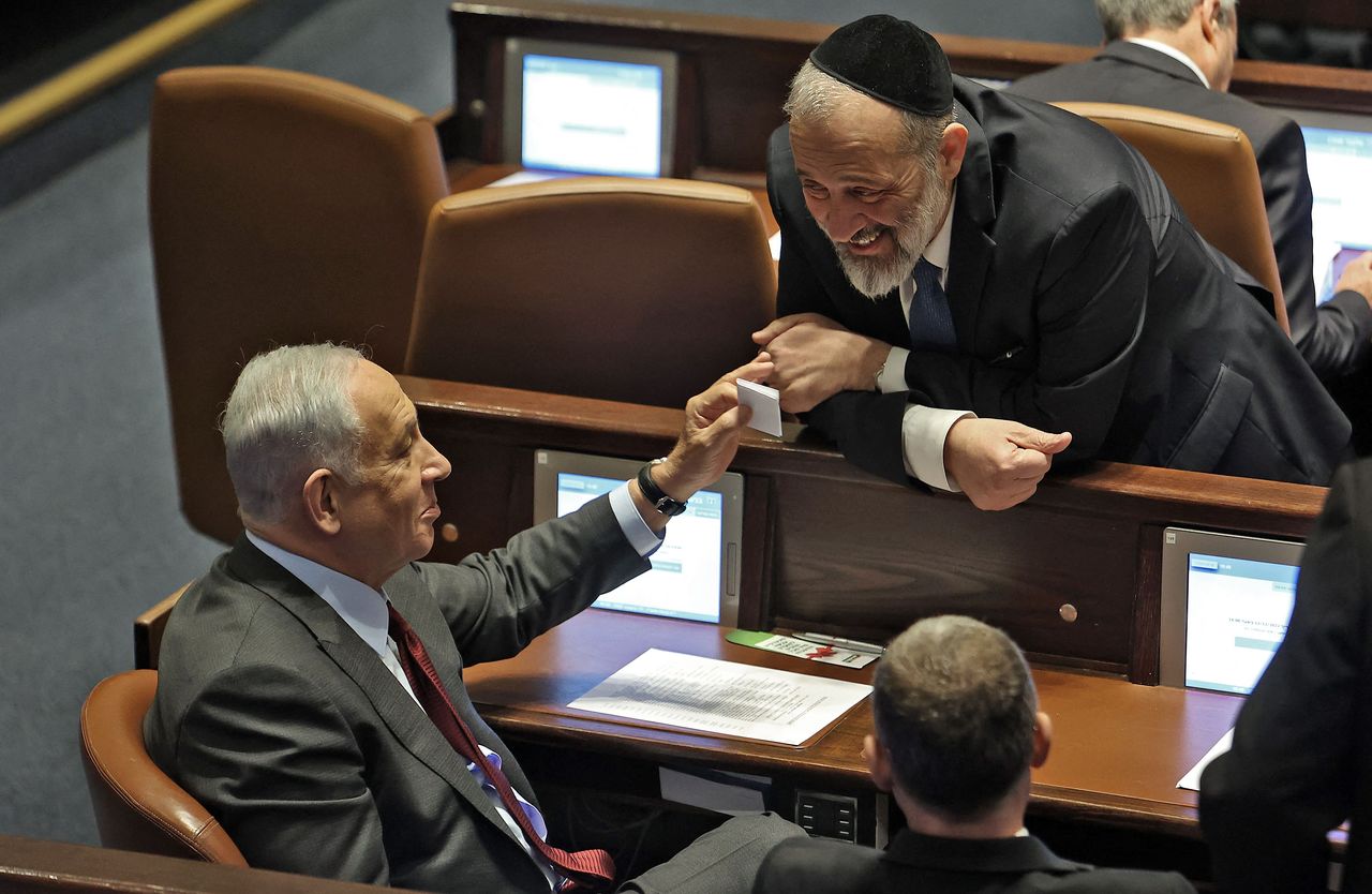 系紅色領帶就坐的本傑明·內塔尼亞胡正推動一項法案,允許站立的盟友阿里耶·德里進入內閣任職。圖片來源:GIL COHEN-MAGEN/法新社/蓋蒂圖片社特拉維夫——本傑明·內塔尼亞胡正推動以色列議會通過多項法案,將其與聯盟夥伴達成的特殊協議法典化,以換取他們的支持,這是他作為總理重返政壇的最後一道障礙。