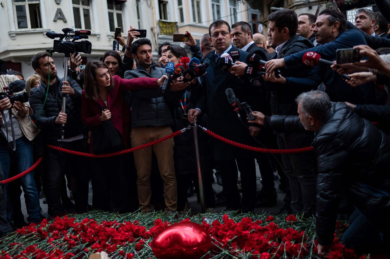 伊斯坦布爾市長埃克雷姆·伊馬姆奧盧(戴眼鏡者)在11月該市繁華購物街發生爆炸後接受記者採訪。圖片來源:亞辛·阿克古爾/法新社/蓋蒂圖片社土耳其當局最初宣佈伊斯坦布爾選舉結果無效,但伊馬姆奧盧在同年晚些時候的重新選舉中再次贏得市政控制權。