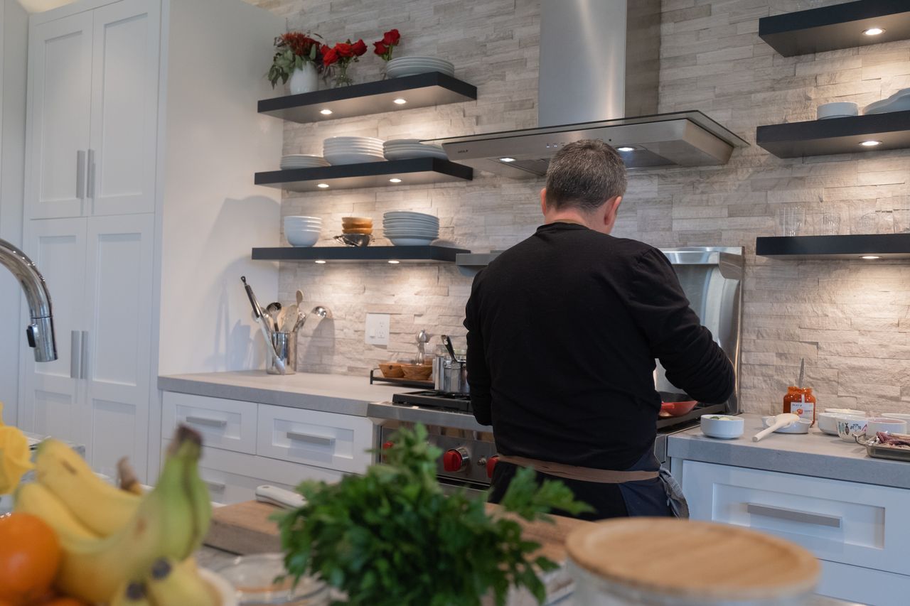 凱森廚師不在雙城的三家餐廳、兩家麪包店和一家咖啡館時,就會在家烹飪。他的家庭烹飪空間出乎意料地簡樸,絲毫沒有專業廚房的感覺。2020年初搬入這所房子時,他幾乎沒改動廚房——只加裝了一塊不鏽鋼防濺板。相反,他花21.5萬美元翻新了一個豪華的雙層露台。