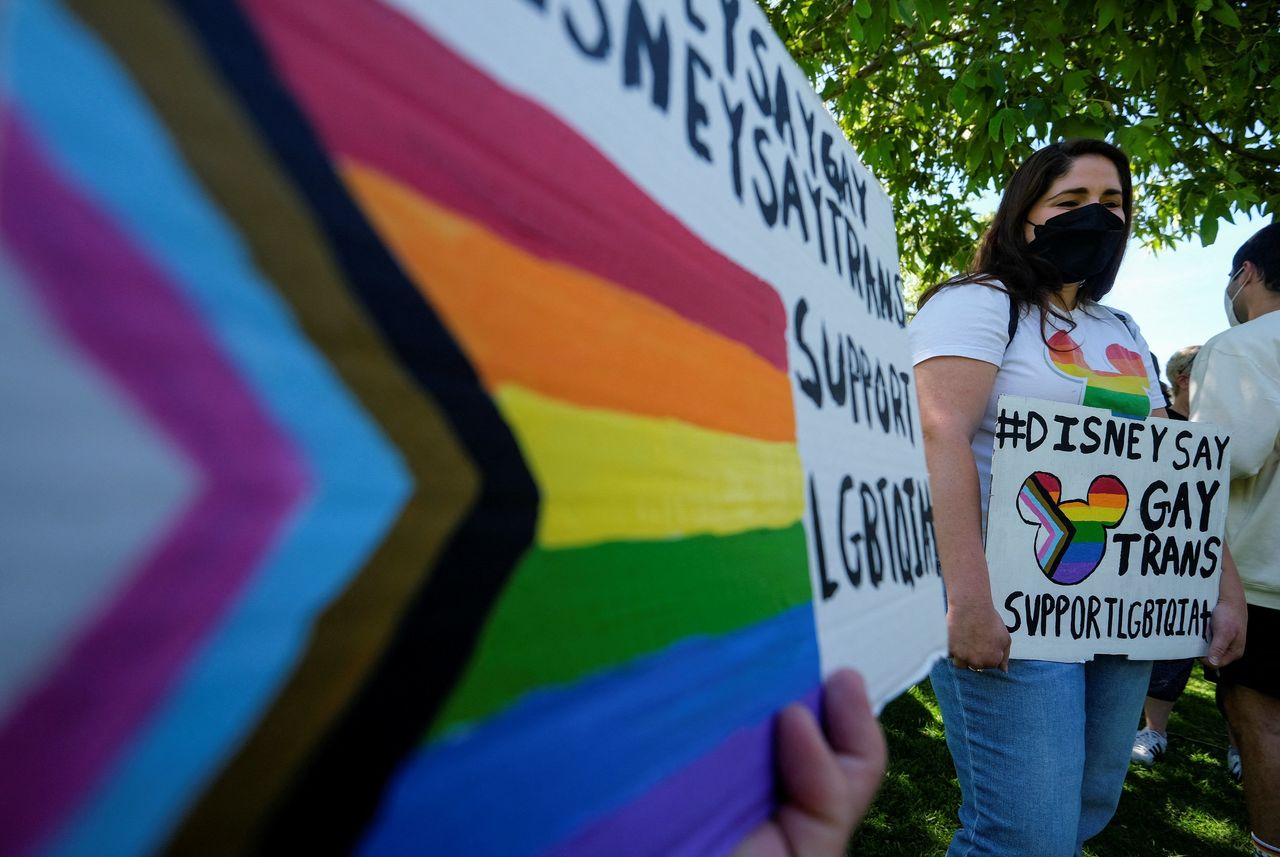 2022年3月,加州格倫代爾的迪士尼員工舉行示威,反對佛羅里達州的《父母教育權利法案》。圖片來源:RINGO CHIU/REUTERS查佩克拒絕對反對者所稱的"不説同性戀"法案表明立場。他在公司內部信中表示:“我們一再看到,企業聲明對改變結果或想法幾乎無濟於事。“他的副手們急忙通過郵件安撫員工,指出公司支持男女同性戀、雙性戀和跨性別者(LGBT)事業。