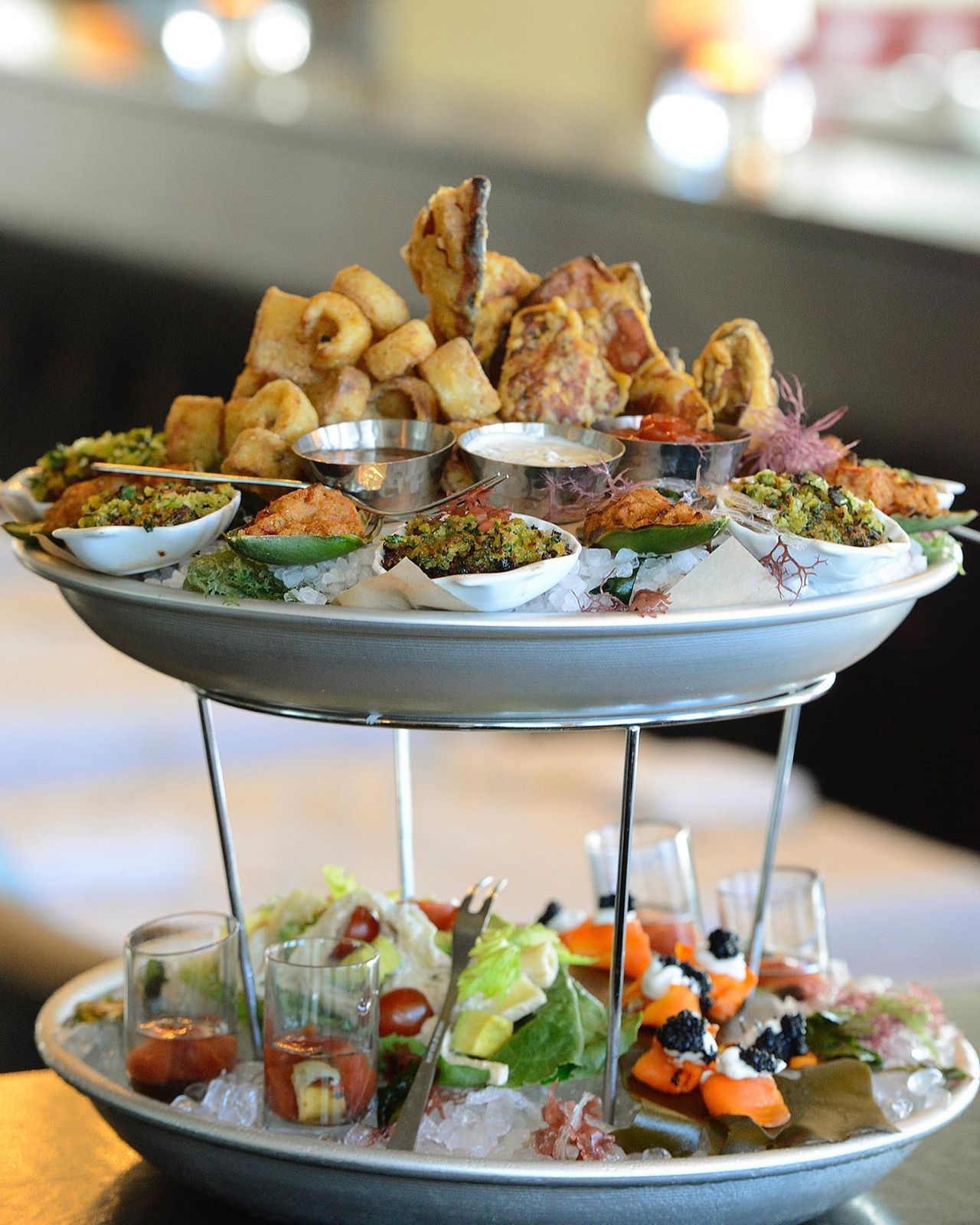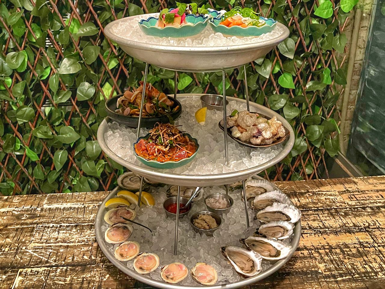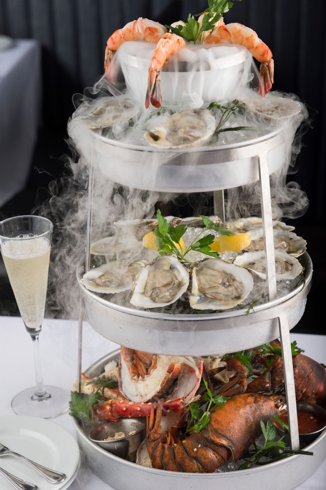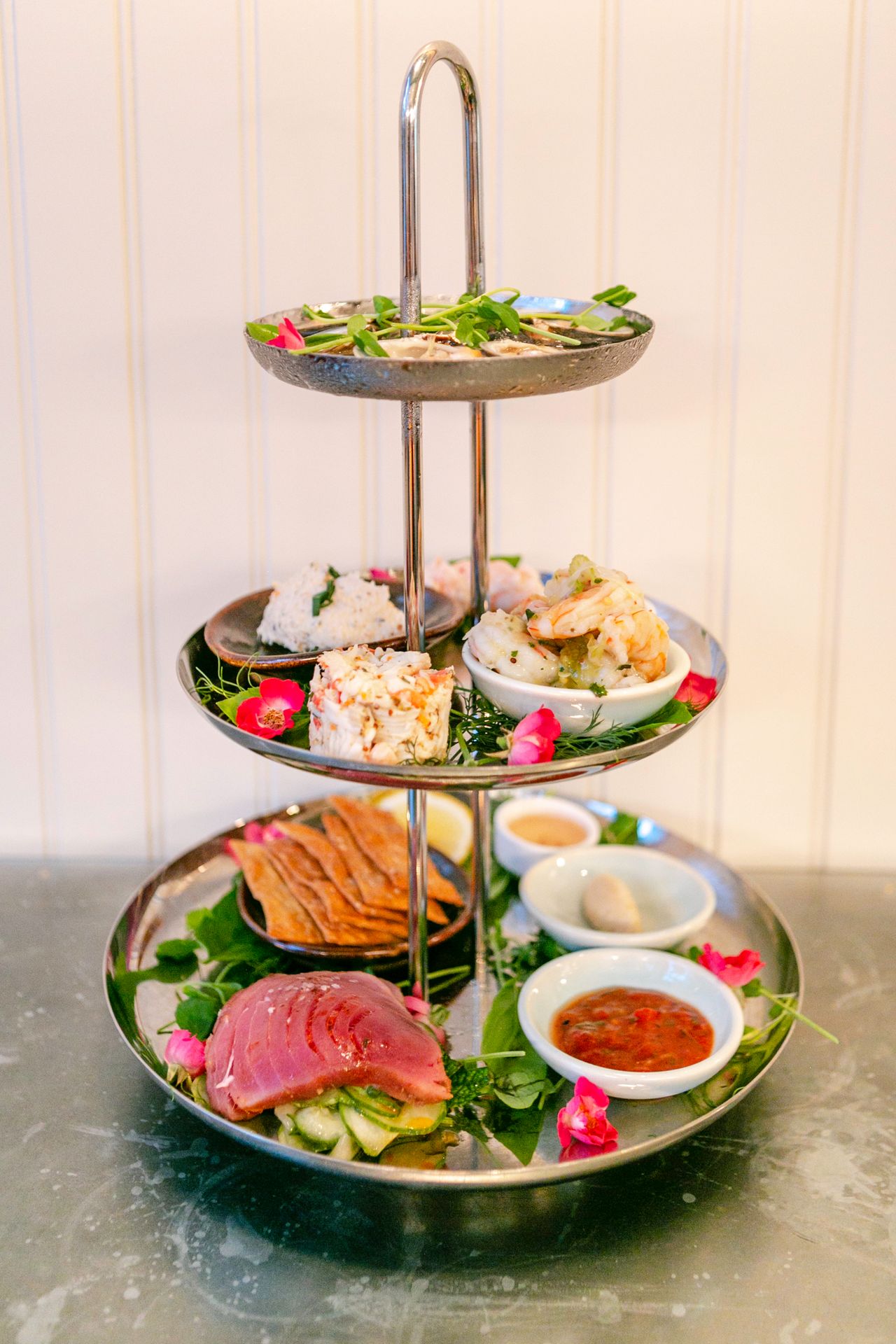 主廚迪恩·內夫的季節性海鮮塔目前包含醃蝦、哈里薩蒜泥蛋黃醬煙燻金槍魚、蛤蜊、醋漬牡蠣、小龍蝦、蟹肉沙拉、生牡蠣、紅薯配生金槍魚、醃沙丁魚以及煙燻灰鱒魚醬,所有食材均來自附近水域。