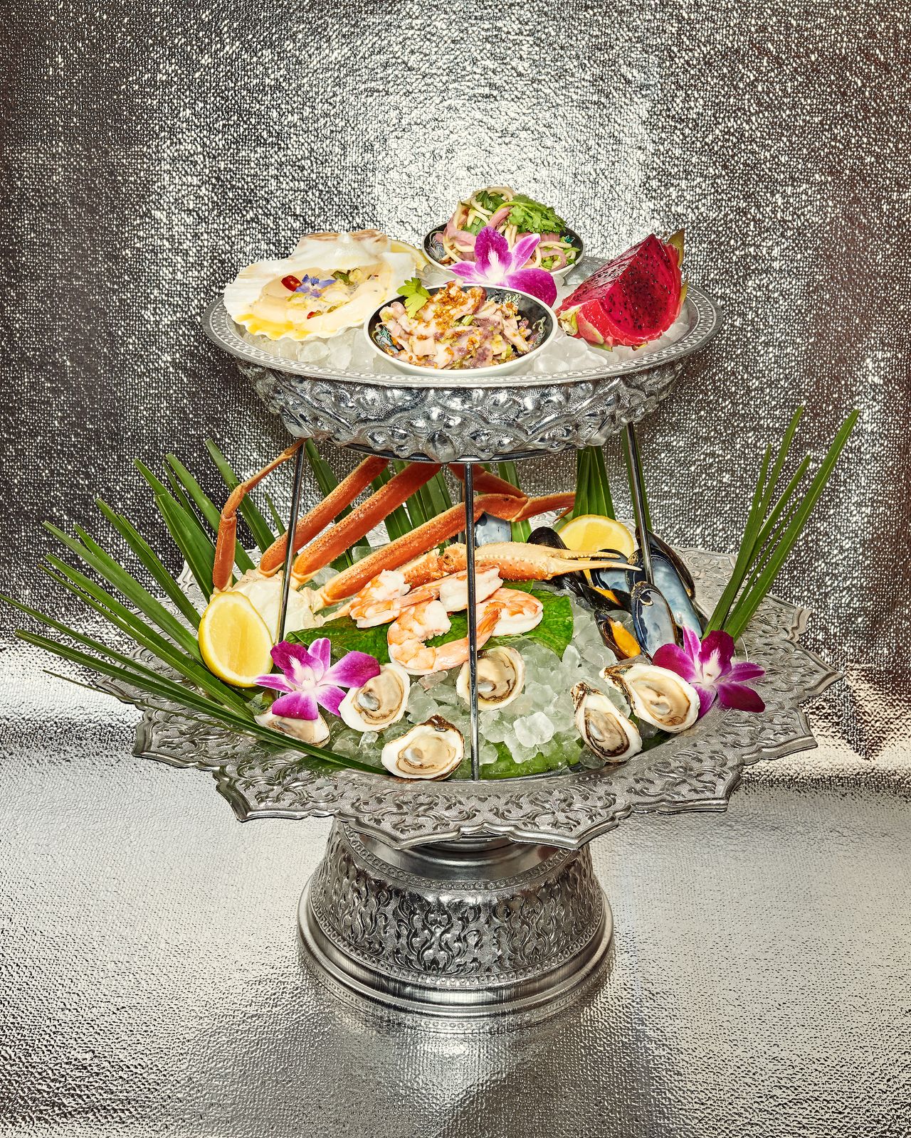 招牌菜"蘇萬那瑪查的獻禮"盛放在華麗的泰式供盤上,包含生蠔、鮮蝦、螃蟹、青口、扇貝、章魚和魷魚,佐以泰式醬汁及配菜。升級"坤大亨套餐"的食客還能享用金水酒、龍蝦,以及搭配椰子酸奶油和印度飛餅的魚子醬。