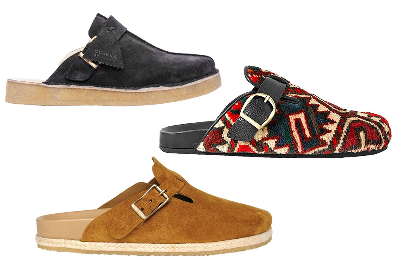 順時針方向從上至下:低調的羊絨內襯款,鞋履,190美元,ClarksUSA官網;採用古董地毯打造的獨特設計,King Kennedy鞋款,850美元,MrPorter官網;搭配粗獷迷人的黃麻中底,鞋履,407美元,Yuketen官網