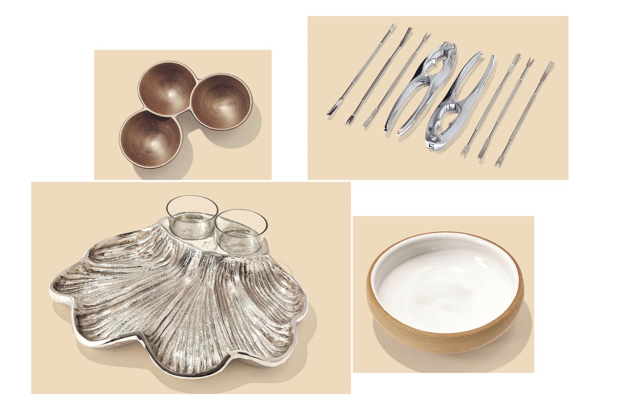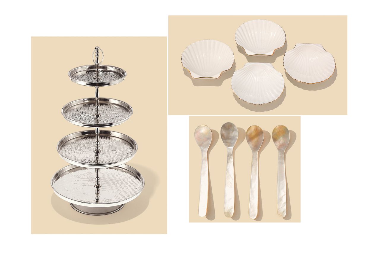 左上順時針方向:錘紋四層點心架,92美元,Mikasa官網;貝殼開胃菜盤,75美元,Aerin官網;六件套勺具組,125美元,CaviarRusse官網