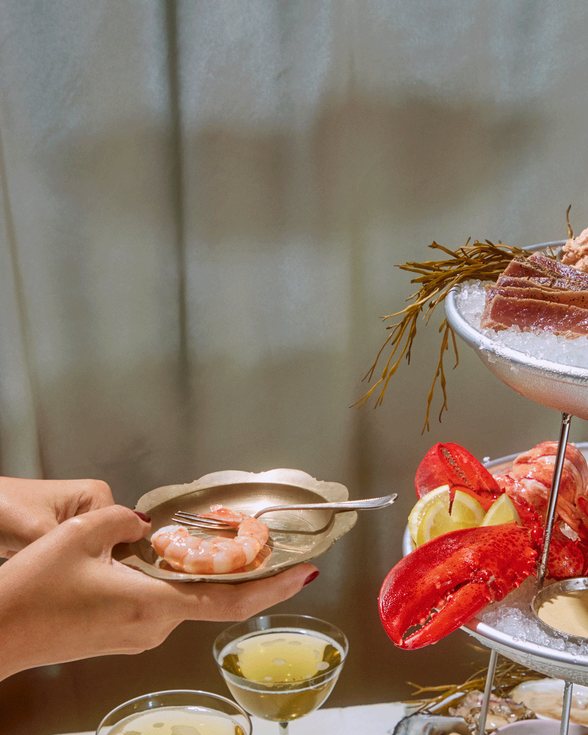 一進入位於紐約布魯克林的"雙貓"(Deux Chats)新藝術風格酒吧餐廳,首先映入眼簾的是吧枱上鋪滿碎冰的奢華海鮮展示:蟹腿、龍蝦鉗、鮮蝦、生蠔、蛤蜊與陽光檸檬錯落有致。用餐區內,雙層海鮮塔經過時總能吸引眾人目光。當這座塔降臨我的餐桌時,底層可見貽貝、生蠔和蛤蜊掩映在海藻絲、醃菜與蘿蔔之間,頂層則排列着紅豔的蟹腿、龍蝦尾和鮮蝦隊列,點綴着芥末魚子醬的三文魚刺身方塊,以及盛放在扇貝殼裏的精緻金槍魚韃靼。