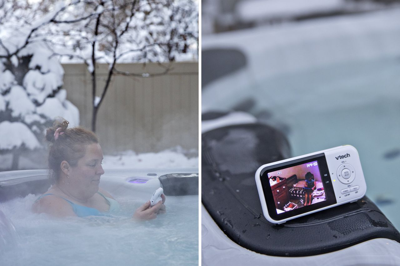 即使在泡熱水浴缸時,凱瑟琳·史密斯也會使用嬰兒監視器,以防女兒從牀上叫她。照片:Kim Raff為《華爾街日報》拍攝(2)這位來自猶他州霍拉迪的母親説,她在外面泡家庭新裝的熱水浴缸或看電視時會查看監視器。她的丈夫從不使用監視器。最近的一個晚上外出時,他在泡熱水浴缸。因為嬰兒監視器在室內,他一開始沒有聽到8歲女兒叫他。