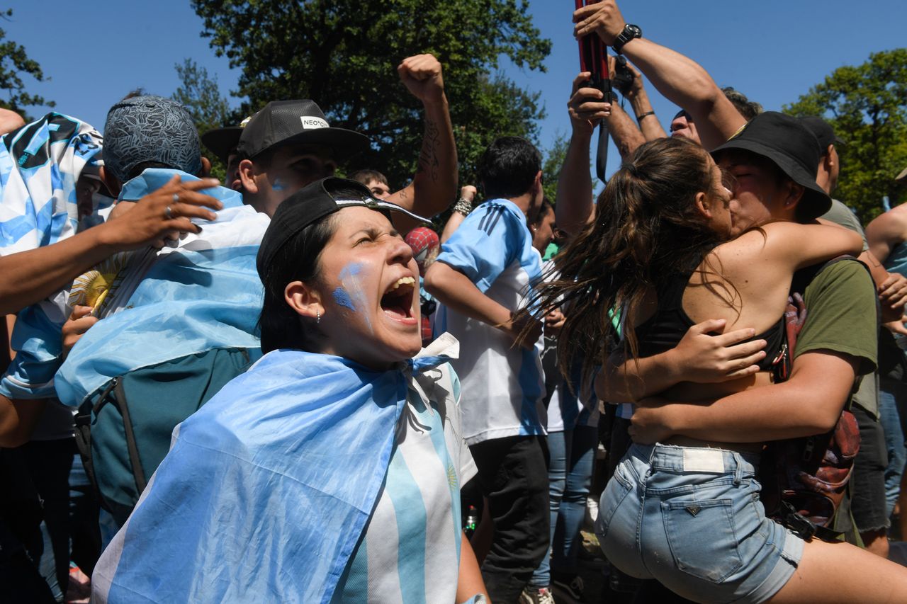 當阿根廷隊以4-2的點球大戰獲勝後,首都的公園裏擠滿了球迷,他們在巨型屏幕前跳躍歡呼,空氣中瀰漫着飛揚的塵土。身着藍白相間隊服的球迷在緊張刺激的比賽結束後相擁而泣。在公園和城市街道上,他們噴灑着泡沫噴霧,揮舞着國旗,高喊“梅西把世界盃帶回家了”,當最後一粒點球擊中球網時。