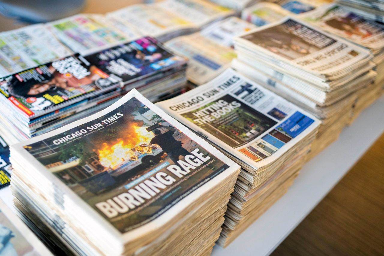 堆積如山的《芝加哥太陽時報》報紙。照片:Pat Nabong/美聯社刊登於2022年12月21日印刷版,標題為《芝加哥新聞除了犯罪一無所有》。
