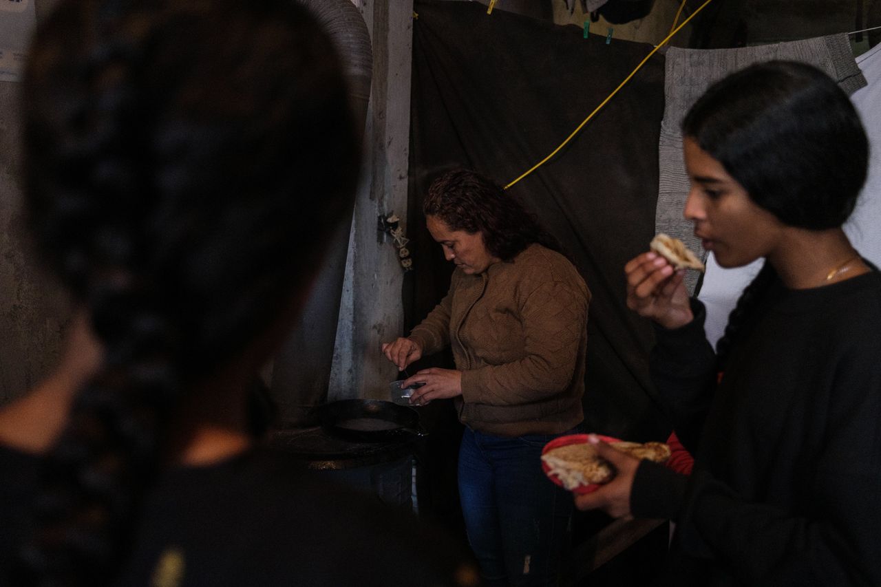 一位移民在墨西哥"移民綠洲"庇護所為她的孩子們做飯。