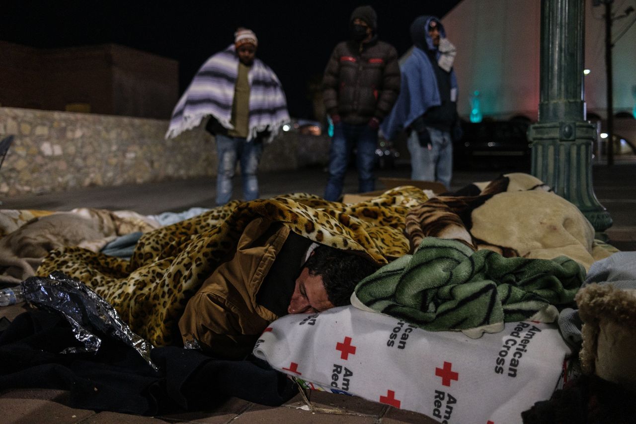 移民們蜷縮在埃爾帕索市中心灰狗巴士站附近的毯子裏,他們在冰點氣温中露宿街頭。