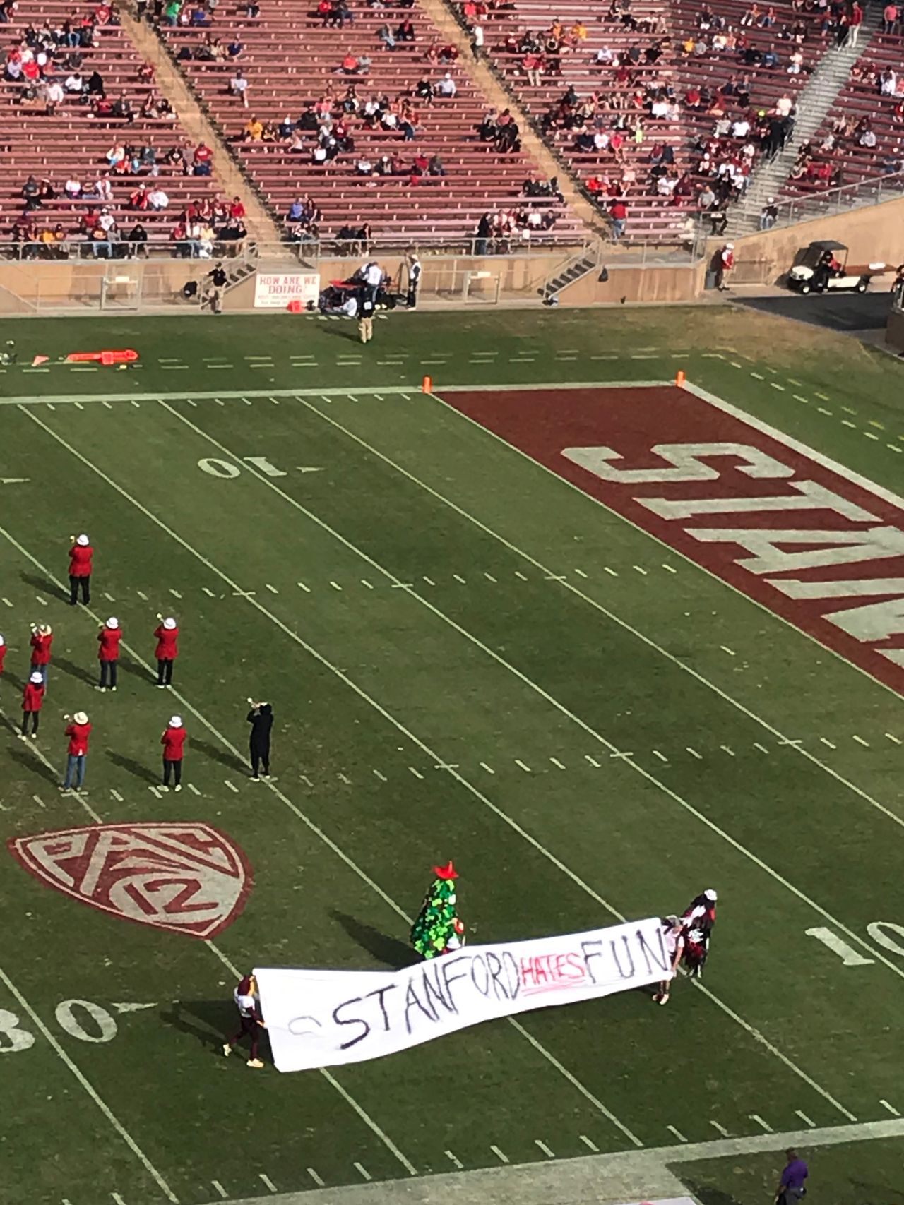 斯坦福與亞利桑那州立大學電視轉播比賽的中場休息時,這棵"人形樹苗"走進球場。在ASU吉祥物"太陽惡魔火花"的協助下,斯坦福樹展開了一條40英尺長的橫幅,上面寫着"斯坦福憎恨快樂"。