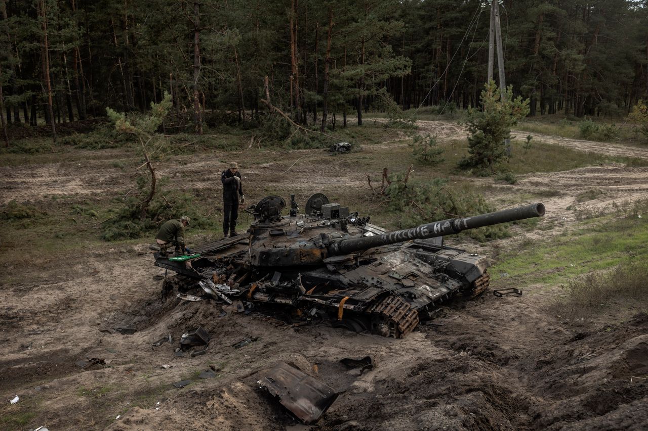 烏克蘭士兵在烏克蘭庫皮安斯克拆卸一輛俄羅斯坦克以獲取零件。
