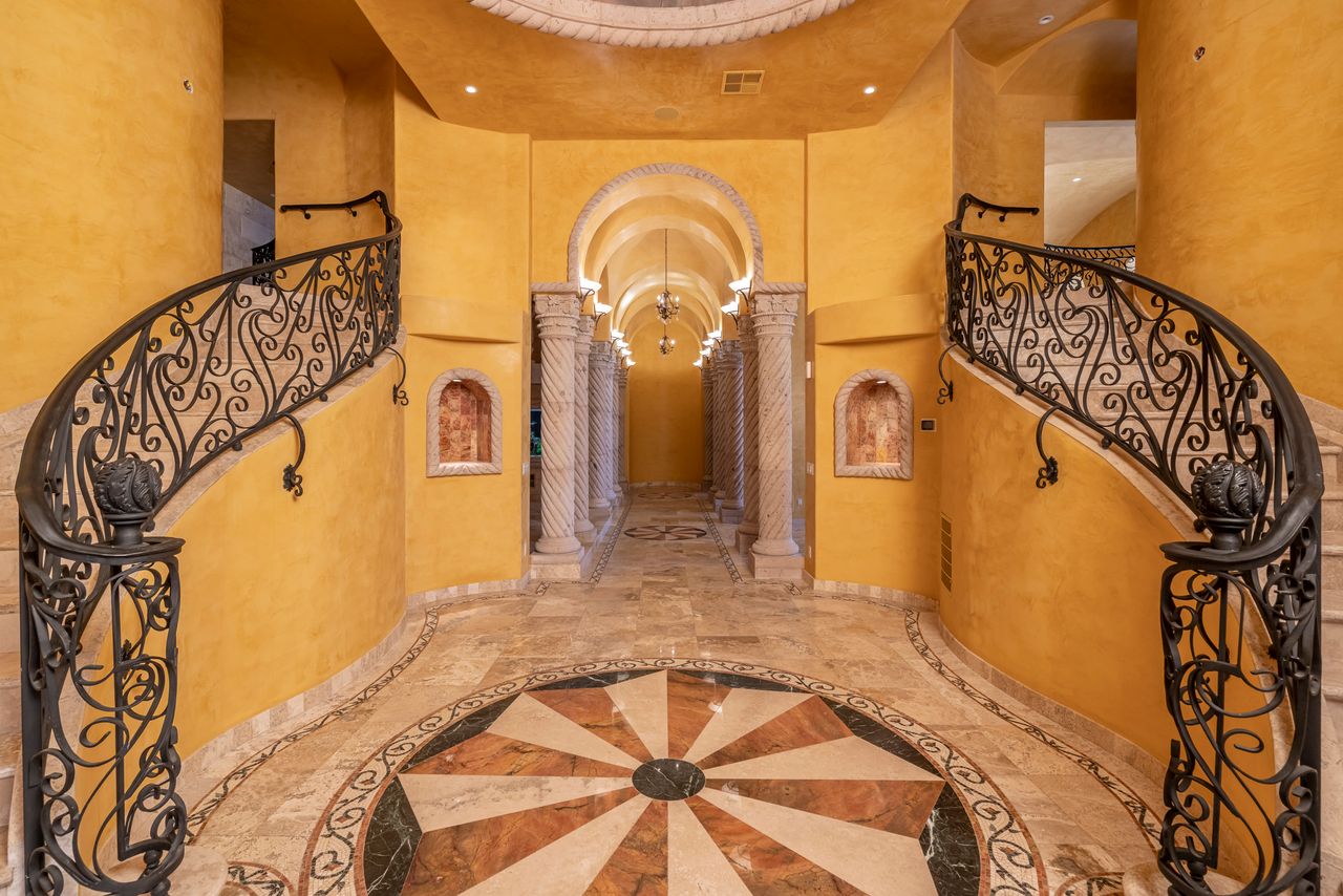 兩隻大型大理石獅子坐落在泳池區域的入口處。在三居室的主屋中,兩條弧形樓梯通向二樓,那裏有一個室內陽台,可以俯瞰門廳、廚房、餐廳和客廳。米尼奧先生説,石灰華瓷磚是從墨西哥進口的,並用拖車運到了家裏。