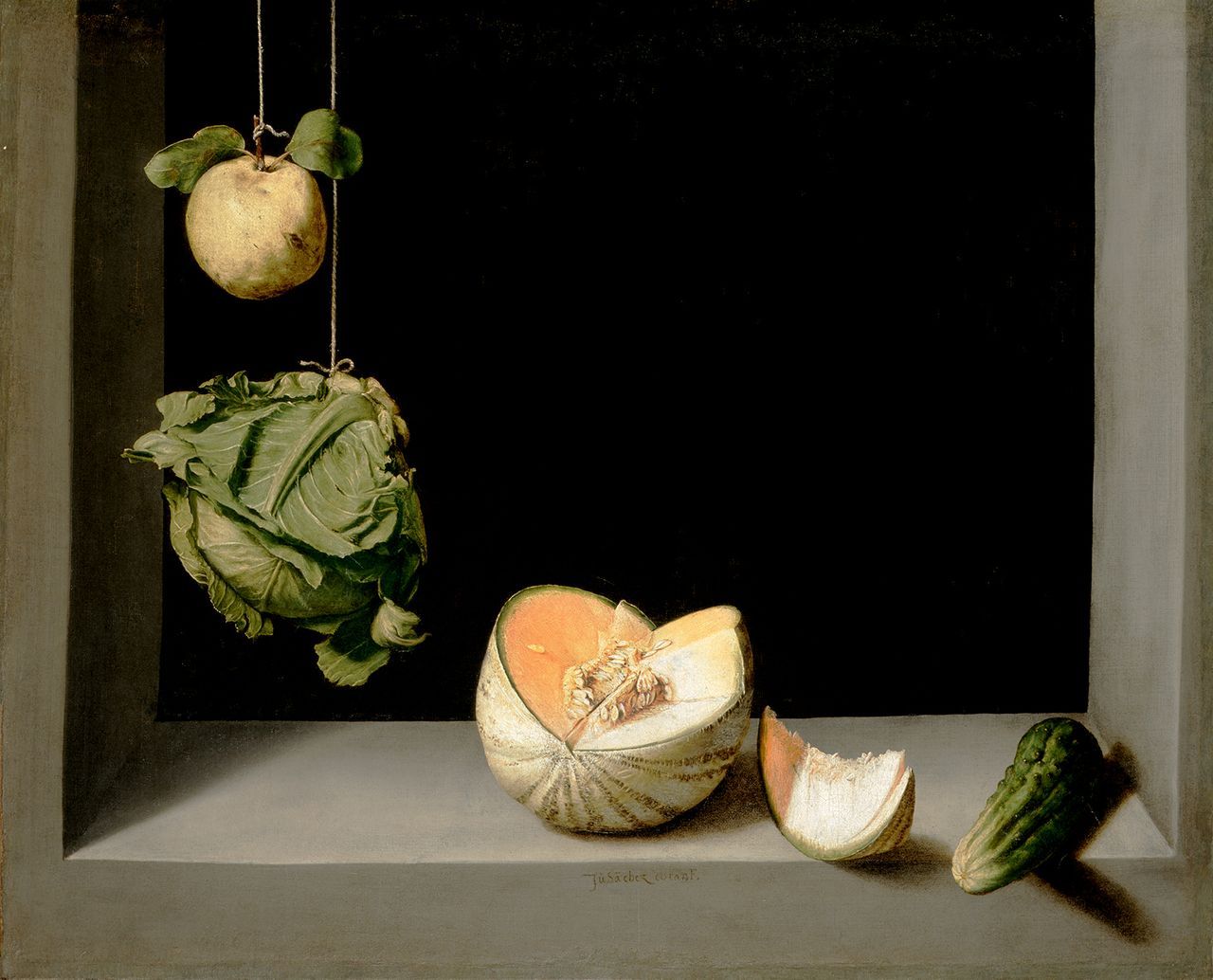 有些畫作身世成謎;另一些則本身就是謎。胡安·桑切斯·科坦的《靜物:榅桲、捲心菜、甜瓜與黃瓜》(約1602年)兼具二者特性。我們僅知這幅畫的流傳脈絡,對其創作緣由或委託人卻一無所知——幾個世紀以來,畫中內容始終引發着無盡猜想。