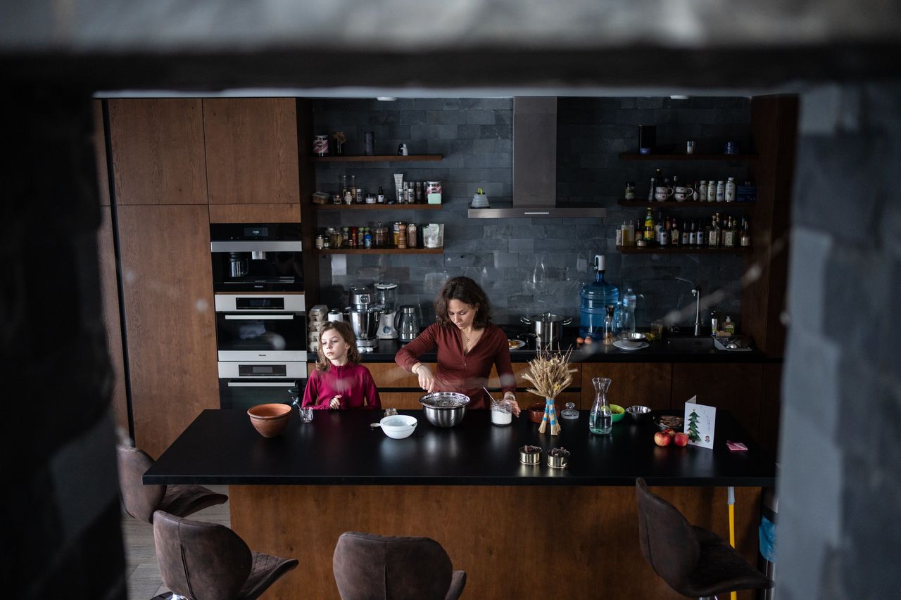 她的丈夫、兒子和女兒,以及家裏的狗和貓,近日都安靜地旁觀製作過程,直到空襲警報響起,全家人躲進地下室以相對安全地躲避俄軍襲擊。