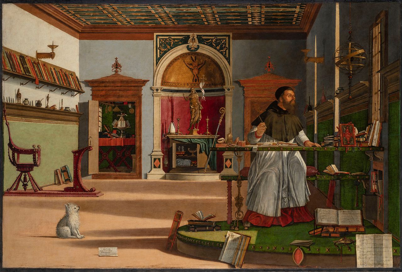 值得探索之處不勝枚舉。在最新修復的10英尺寬畫作《聖喬治與龍》(約1504-1507)中,來自斯齊亞沃尼聖喬治學校的這幅作品描繪了身披鎧甲的聖徒策馬刺穿卷尾怪獸的場景,地面散落着先前受害者的骸骨與殘肢,其間還遊走着蛇類和蜥蜴。同系列的傑作《書房中的聖奧古斯丁》(1502年後不久)裏,我們能清點高頂房間的所有陳設:散落的書籍、海螺殼、古代雕塑、祭壇上基督像旁的主教權杖與法冠,以及聖徒書桌下用於隔絕寒冷地面的踏板——所有細節都被一隻機警卻略顯輕浮的蓬鬆白狗盡收眼底。更不用説全神貫注的聖徒本人,以及既營造氛圍又象徵神聖時刻的那幾束光線。