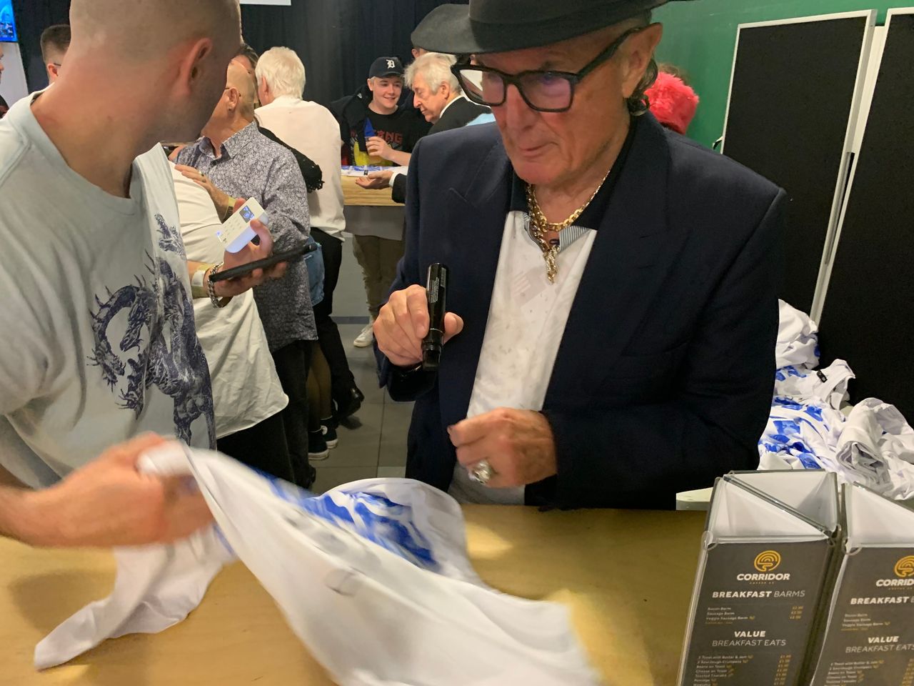 演出結束後,鮑迪奇和貝爾格雷夫先生與十幾歲或二十多歲的粉絲們合影簽名。圖片來源:James Hookway/華爾街日報"Breaker breaker,皮特在酒館裏拿着烤土豆,一手端着啤酒,一手拿着週日報紙,“鮑迪奇先生在其中一首歌中唱道。