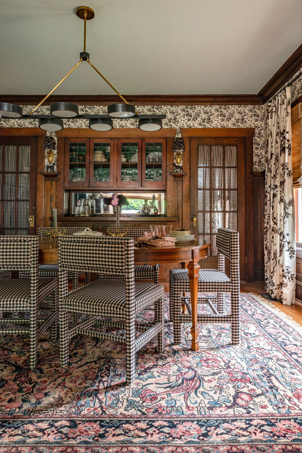 順應原木風格 西雅圖Studio Laloc工作室的室內設計師Lauren Caron保留了原始木作結構,但將木製傢俱減至最少。攝影:Lauren CaronLauren Caron逆流而行,未跟隨當地將20世紀初工藝風平房滿鋪木飾面再刷上雪花石膏漆的潮流。這位設計師認為這種做法會徹底扼殺空間靈魂,“牆面會顯得空洞死板”。在她1916年工藝風住宅的餐廳(如圖),她用濃咖啡色調的古早冷杉木打造嵌入式餐邊櫃和門框,搭配縞瑪瑙與黃金材質現代枝形吊燈形成反差,選用古馳Herbarium系列壁紙,併為帕森斯式餐椅全面包覆軟墊,避免新增木元素。