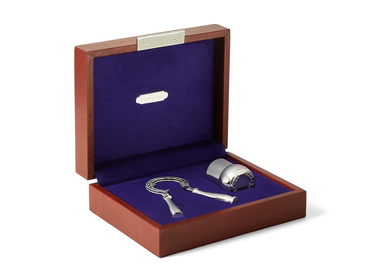 沒有比讓香檳持續流淌更完美的新年禮物了:這款鍍銀鑰匙與瓶塞套裝,收納於麂皮內襯的皮革禮盒中。拉夫勞倫Olian香檳工具套裝,1,500美元。