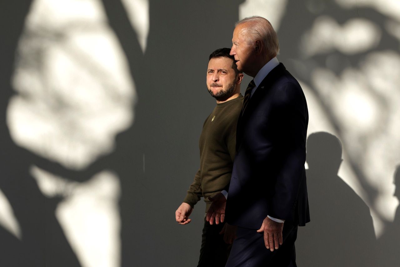 烏克蘭總統弗拉基米爾·澤連斯基身着軍裝,本月早些時候前往華盛頓與喬·拜登總統會面。照片:Alex Wong/Getty Images許多美國官員與他們的法國和德國同行一樣,仍然懷疑烏克蘭能否完全驅逐俄羅斯軍隊,除非北約提供軍事支持,但這將增加與俄羅斯直接戰爭的風險。