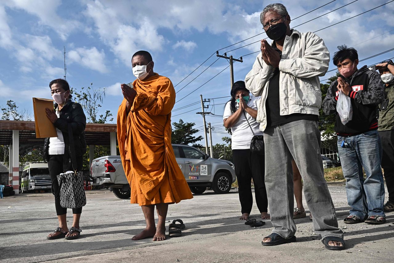 火災遇難者家屬在邊境泰國一側與佛教僧侶祈禱。圖片來源:lillian suwanrumpha/法新社/蓋蒂圖片社週五,警方在建築周圍警告圍觀者遠離,稱這座被燒成灰黑色、外部嚴重損毀的建築有坍塌風險。消防員頻繁進出,救護車將賭場發現的遺體運往附近佛塔。