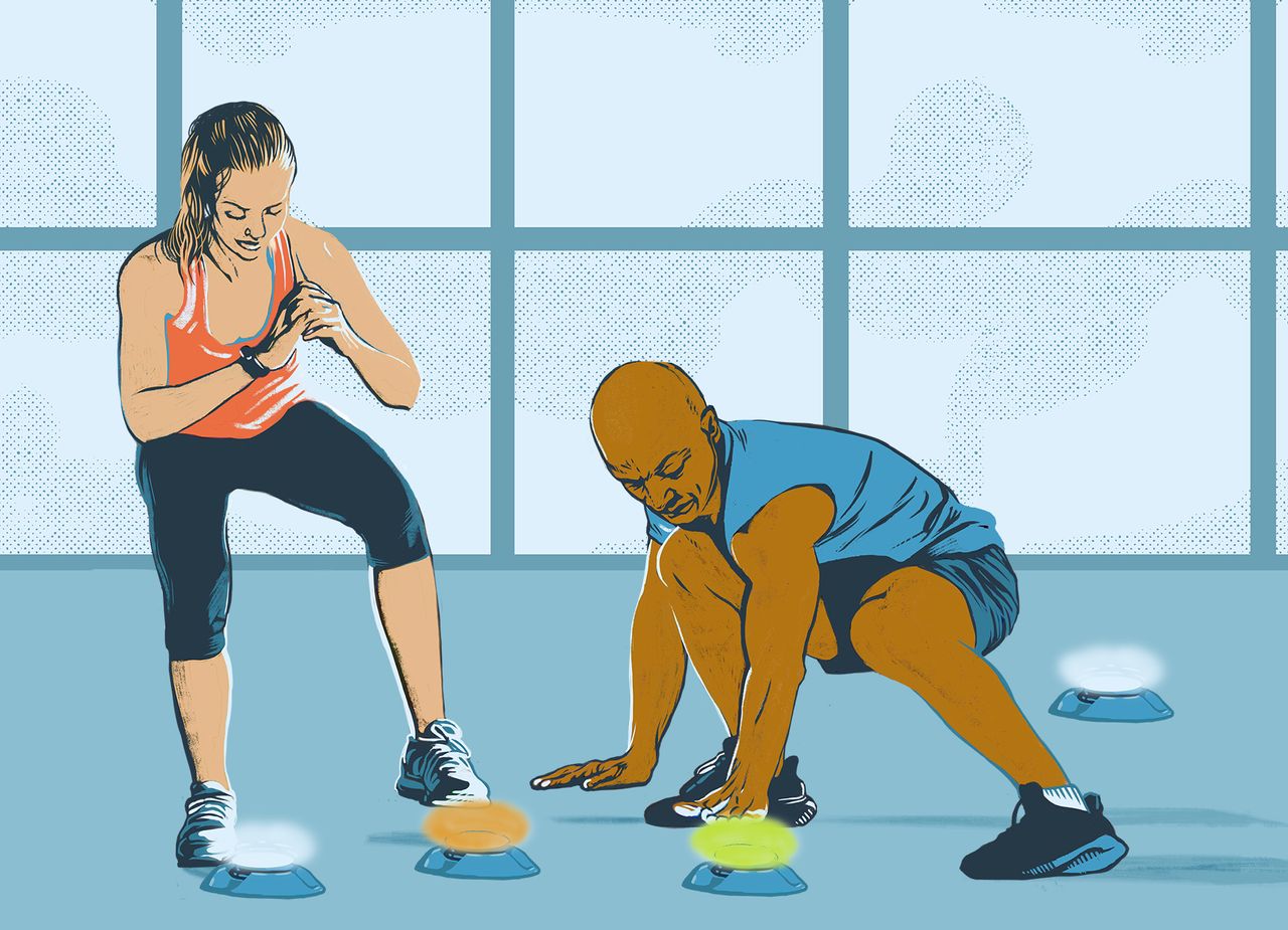 “克里斯·海姆斯沃斯、哈莉·貝瑞等職業運動員和動作片明星都依賴肌肉混淆訓練法,”他解釋道,這種訓練通過高強度循環不斷變換動作組合。King先生表示,多款新型家用健身設備能讓協調敏捷訓練遊戲化。他推薦職業運動隊常用的BlazePod反應訓練燈——可放置地面或貼在牆上的彩色發光圓盤,玩家需在燈光亮起時用手腳觸碰指定顏色。單人訓練或雙人對抗皆可,他還建議挑戰平板支撐時完成觸燈動作以增加難度。