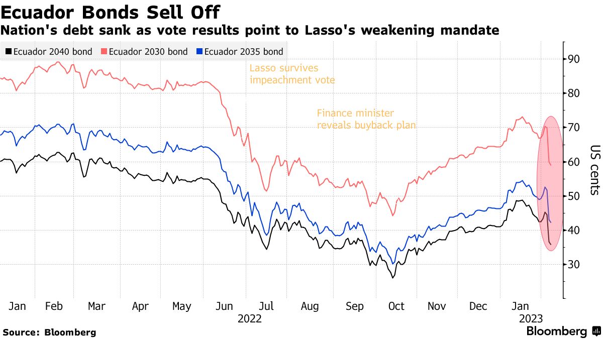 這一結果讓民調機構和投資者都感到震驚,厄瓜多爾2030年到期的美元債券自週日投票以來暴跌約14美分,跌至56美分,創下去年11月以來的最低水平。根據摩根大通公司的數據,投資者要求持有該國債券而非類似的美國國債的額外收益率擴大至14個百分點以上。