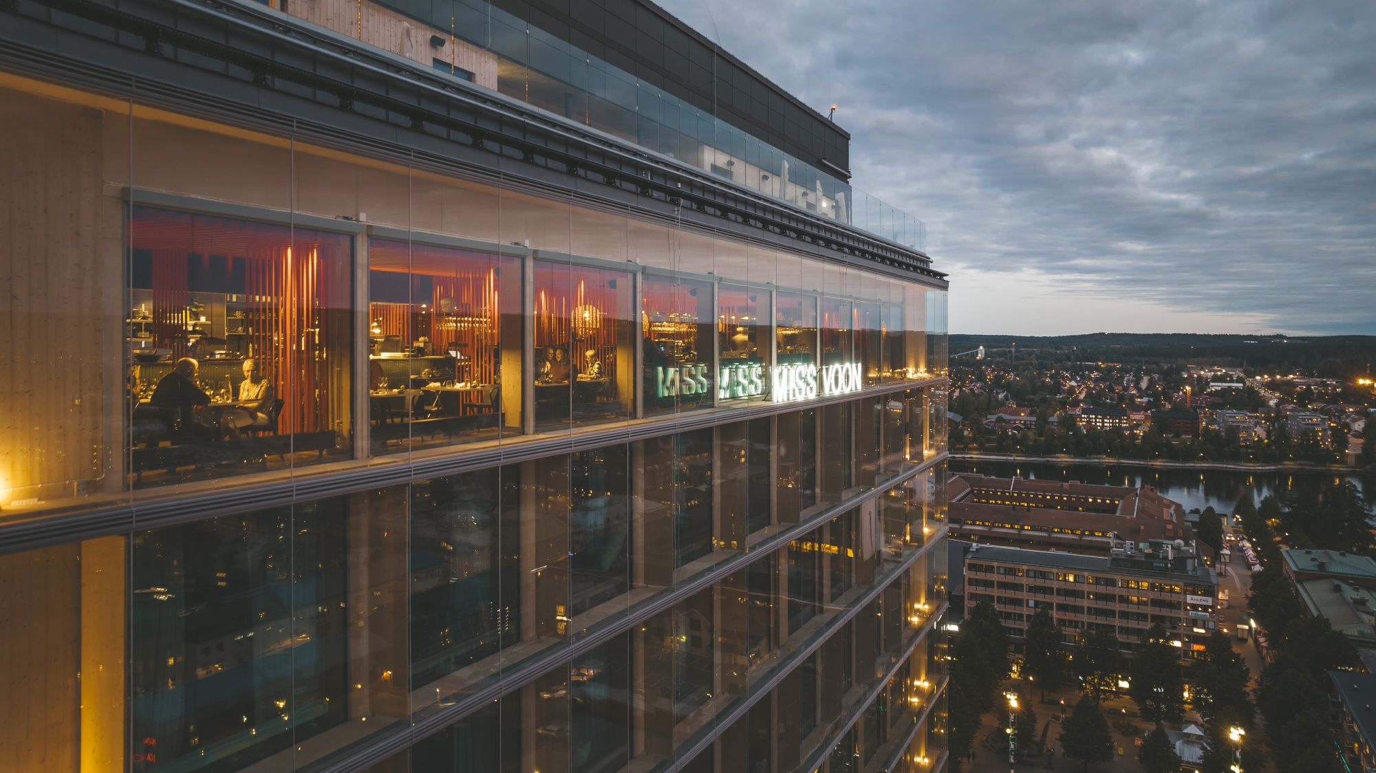 在The Sara頂層的亞洲混合餐廳。攝影師:Jonas Westling/WhiteThe Sara文化中心是一個如何運作的模範。在十二月的一個繁忙的星期五下午,人們可以在寬敞的大堂裏聽到多種語言,在那裏,描繪Skelleftea和鄰近村莊的彩色手工靠墊散落在充滿遊客的樓梯上。其中一位少年正在和朋友們閒逛,等待父母來接他。
