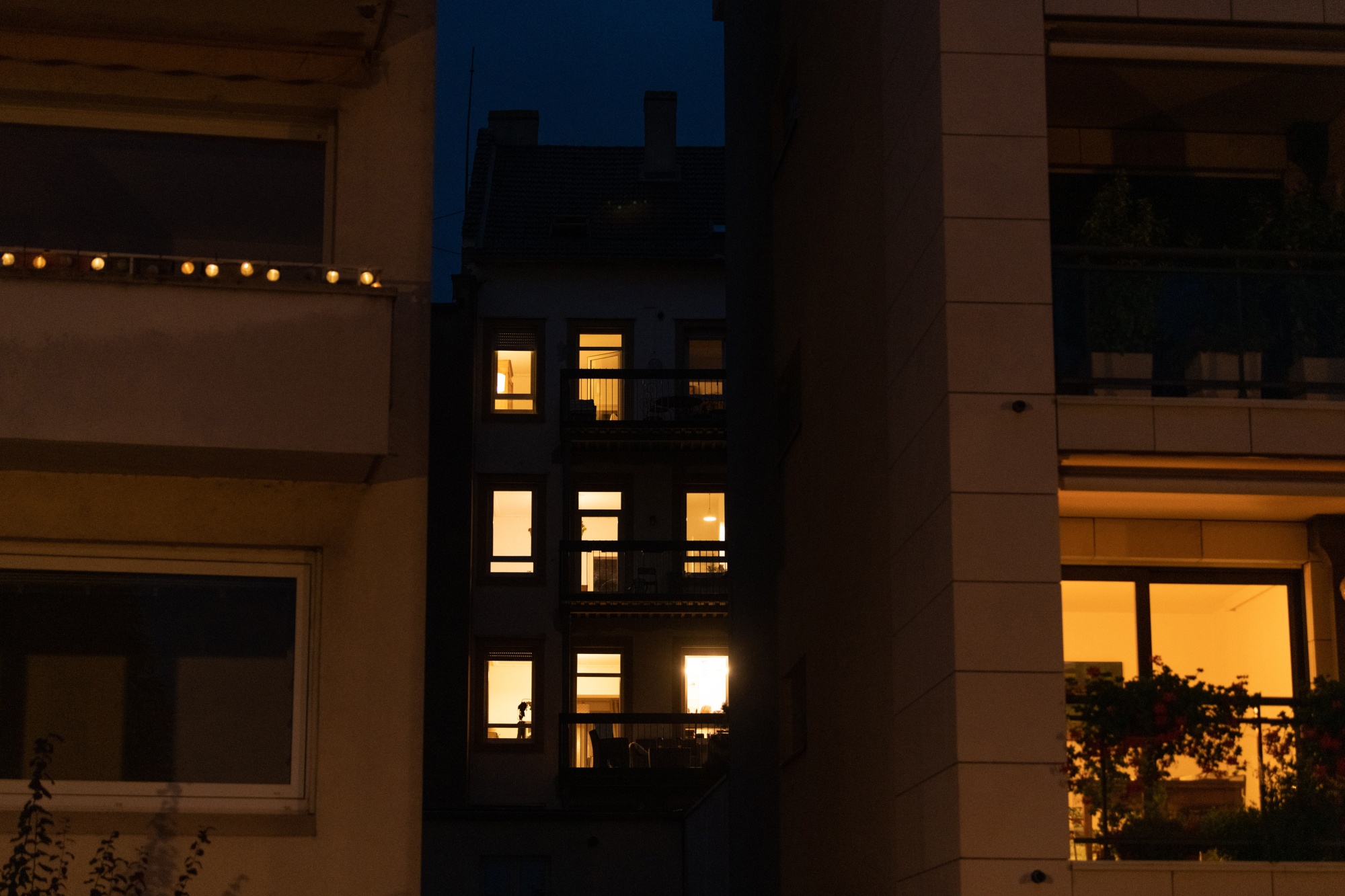 法國斯特拉斯堡一棟部分照明的公寓樓。