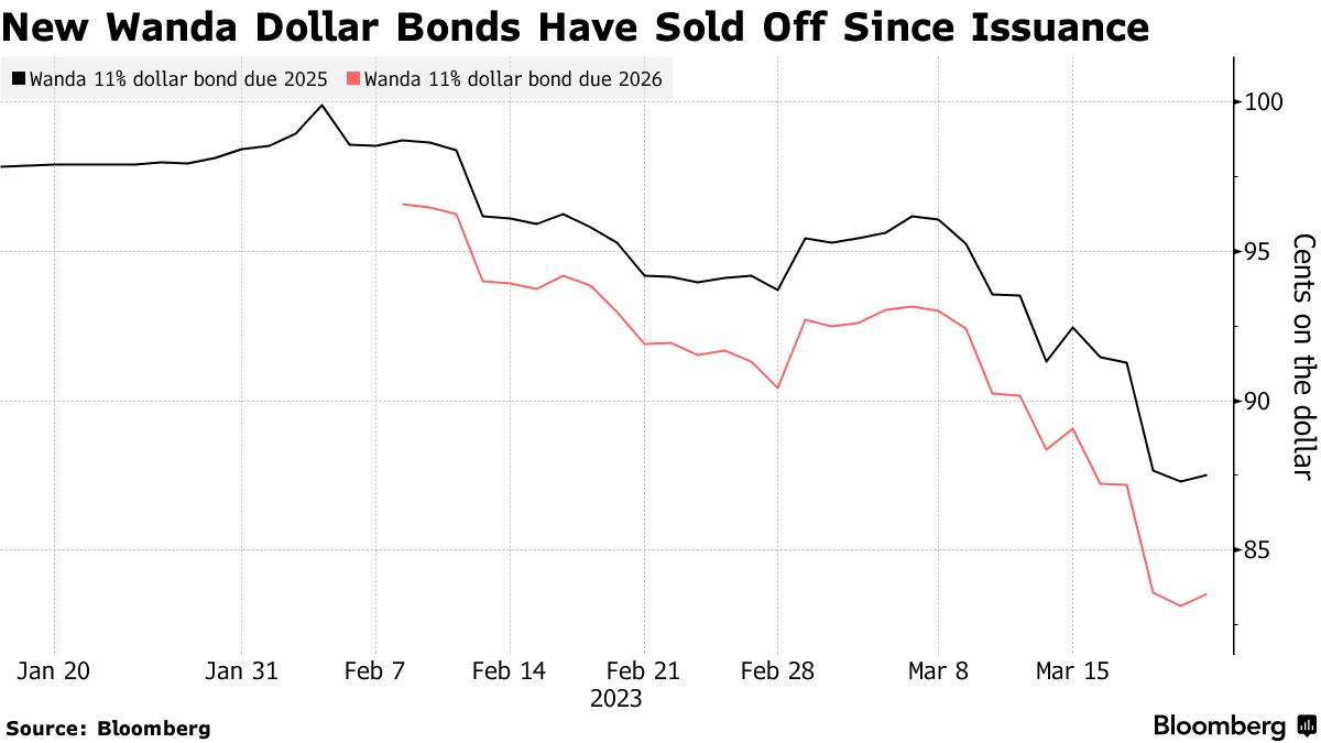 本週萬達商業定價了一筆15億元人民幣的三年期債券。另一個單位,萬達地產環球公司,是今年少數幾家中國開發商中發行新美元債券的公司。根據彭博社編制的價格,這兩筆新的離岸債券的收益率約為19%。