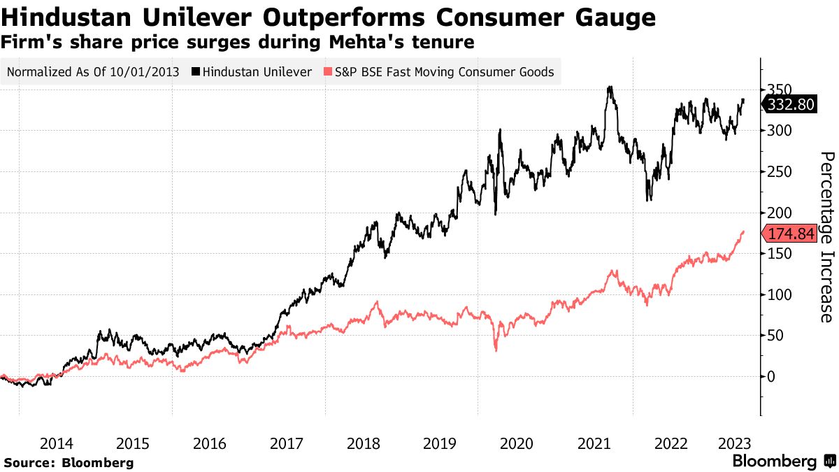梅塔在這家全球消費品巨頭已經度過了三十多年的時間,自2013年擔任首席執行官以來,將印度聯合利華的市值增加了四倍以上,達到760億美元。他還主導了近十次收購,包括購買了葛蘭素史克消費保健有限公司——這是印度最大的家庭用品交易之一。