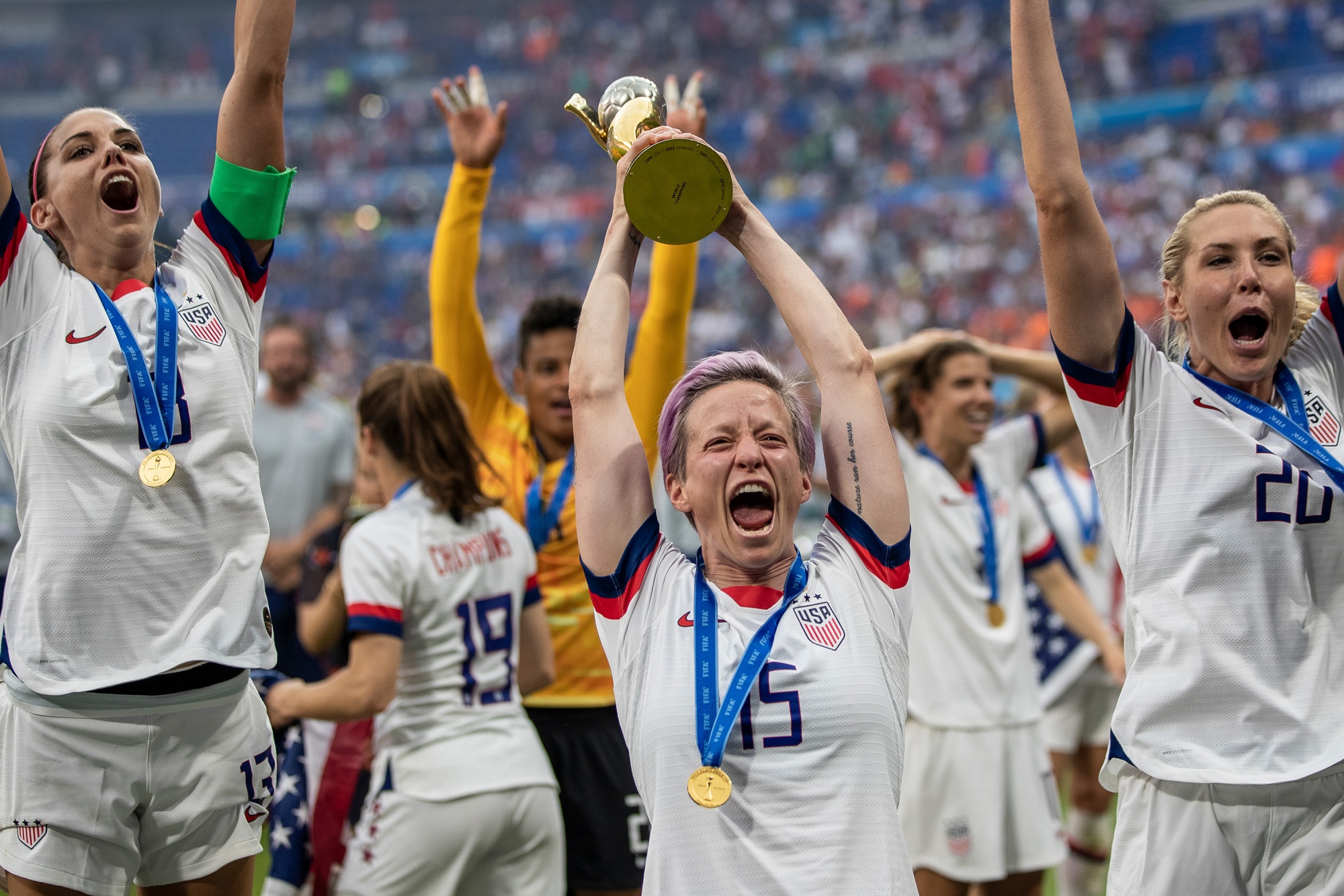 美國的梅根·拉皮諾慶祝她所在球隊在2019年FIFA女足世界盃決賽中獲勝後,她拿着FIFA女足世界盃獎盃在法國里昂慶祝。